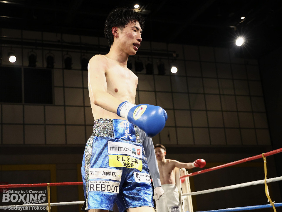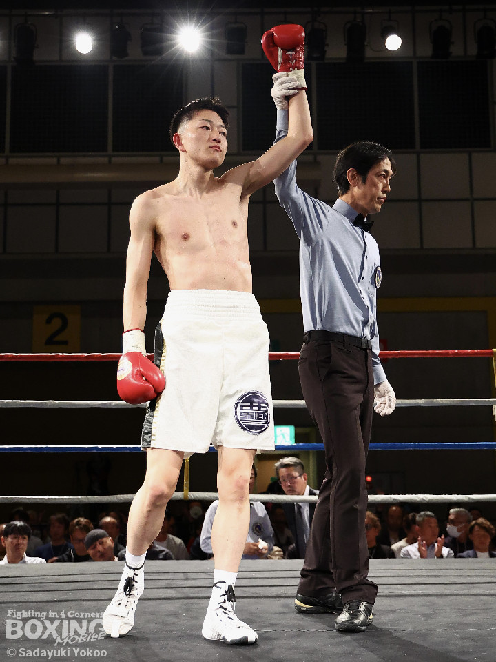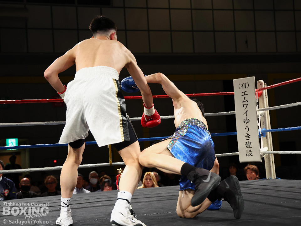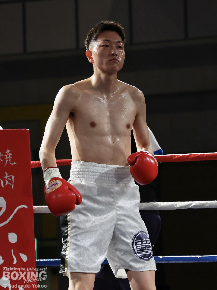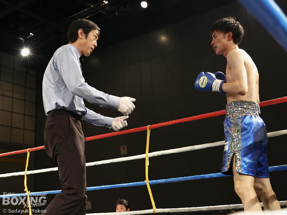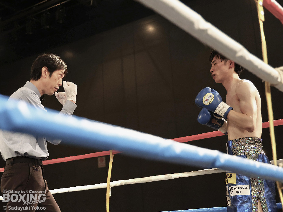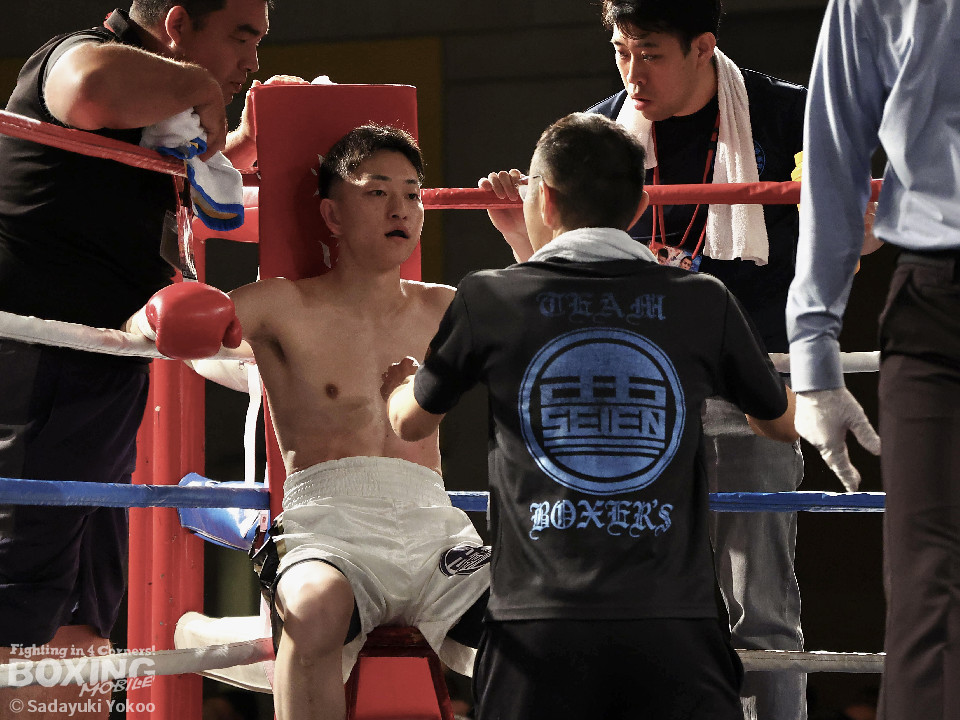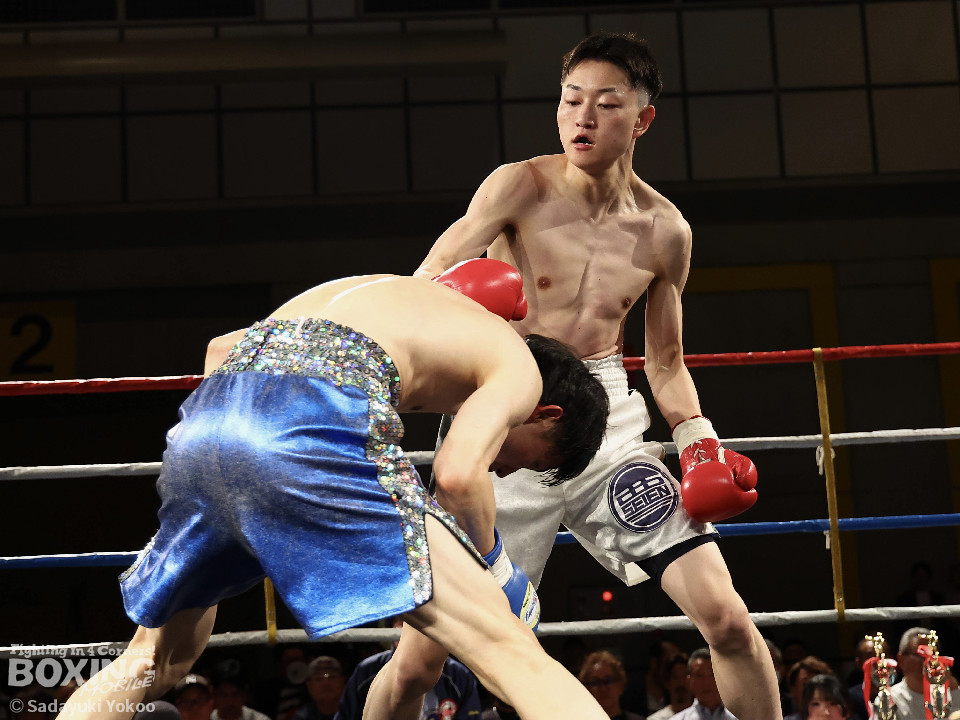 試合:青山がサークリングしながらトリッキーな動きでペースを乱しにいくのに対し、サウスポー中井はやりにくさを感じながらも単発の左ボディストレートをヒット。2回、中井は左ストレートで突き放すと左アッパーを合わせてダウンを先取。3回、中井はパンチをまとめて2度目のダウンを奪取。立ち上がった青山だがレフェリーはストップした。