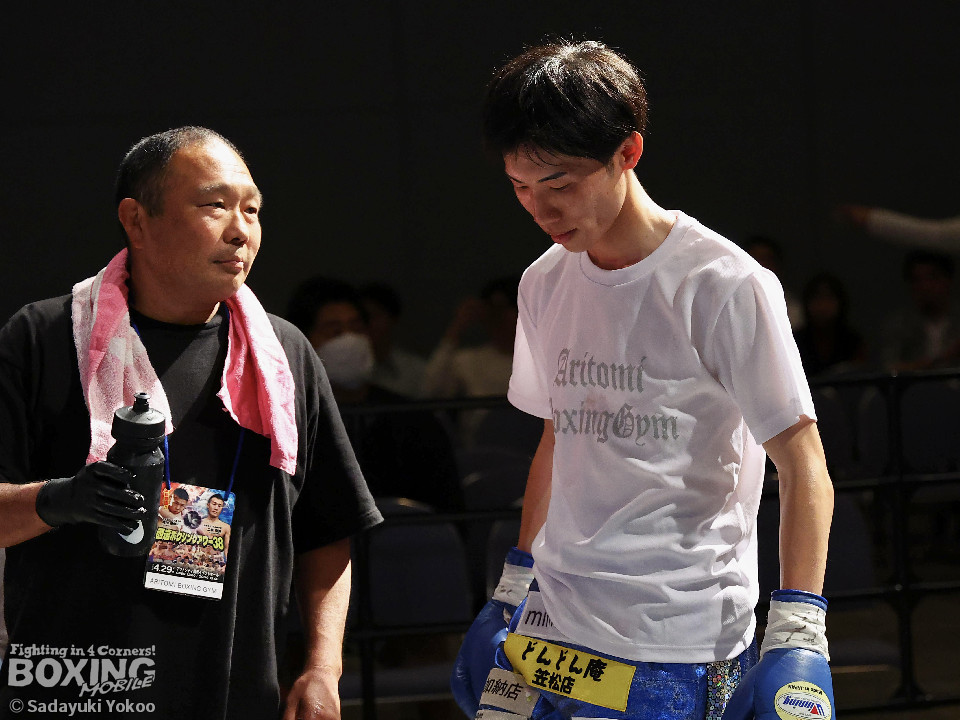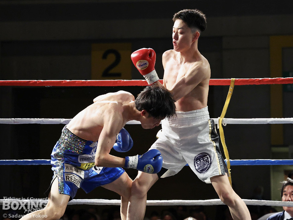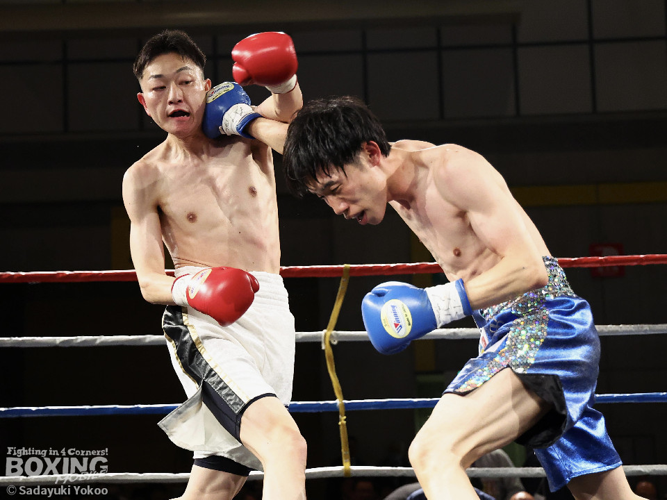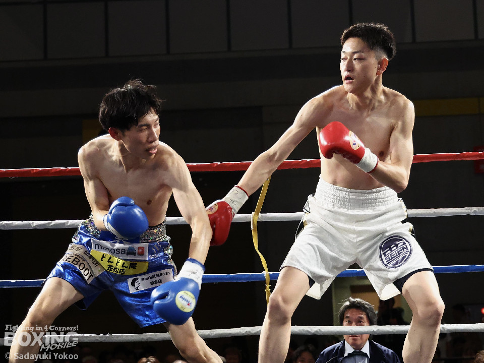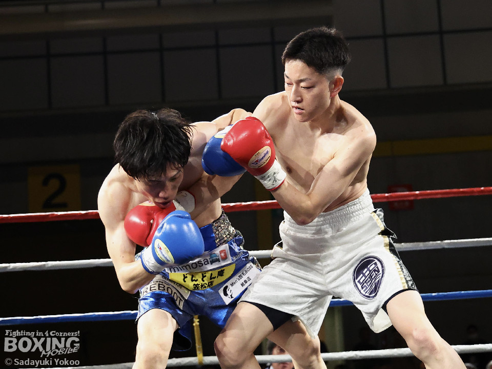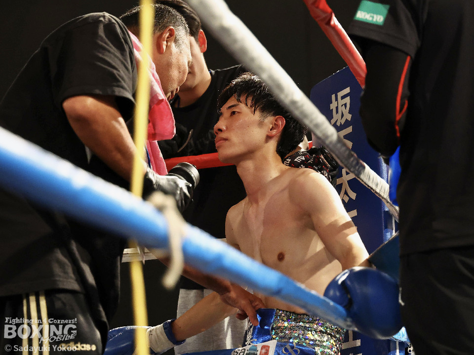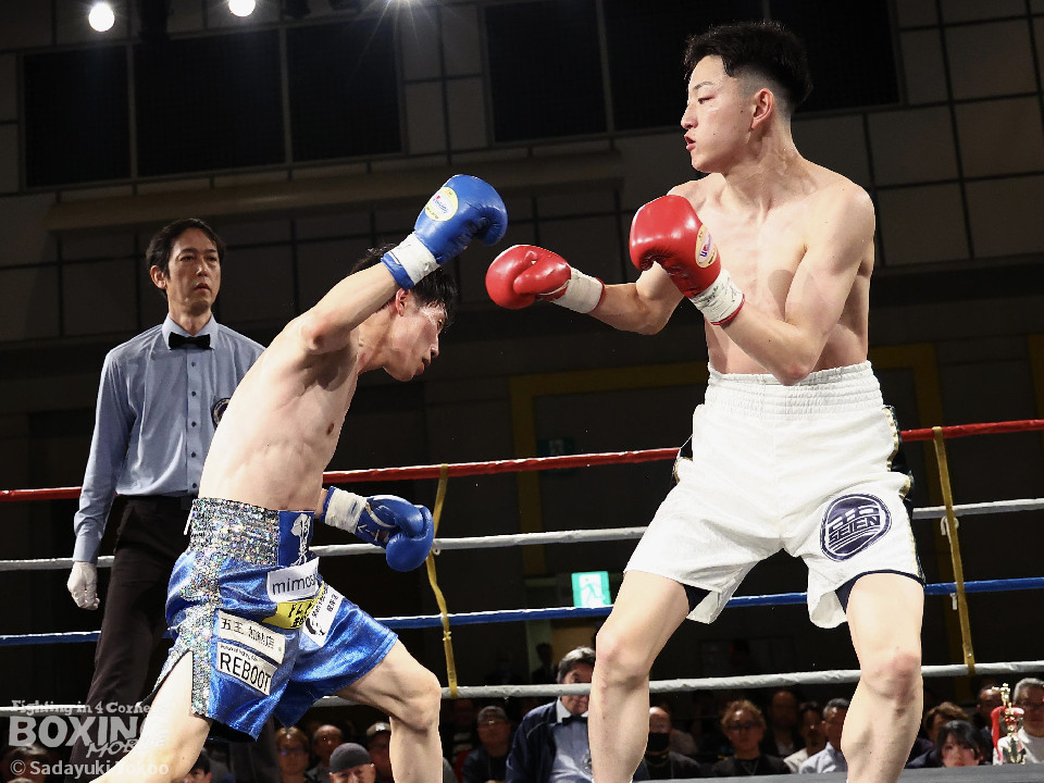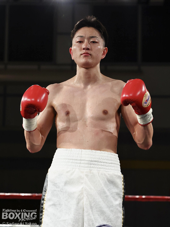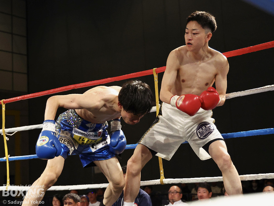 試合:青山がサークリングしながらトリッキーな動きでペースを乱しにいくのに対し、サウスポー中井はやりにくさを感じながらも単発の左ボディストレートをヒット。2回、中井は左ストレートで突き放すと左アッパーを合わせてダウンを先取。3回、中井はパンチをまとめて2度目のダウンを奪取。立ち上がった青山だがレフェリーはストップした。