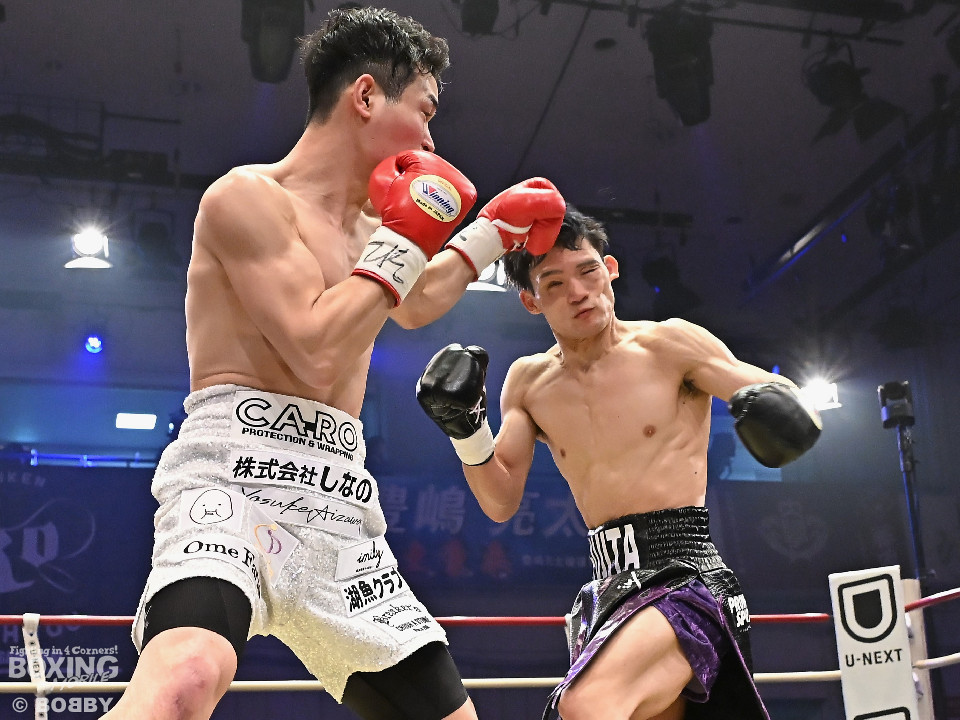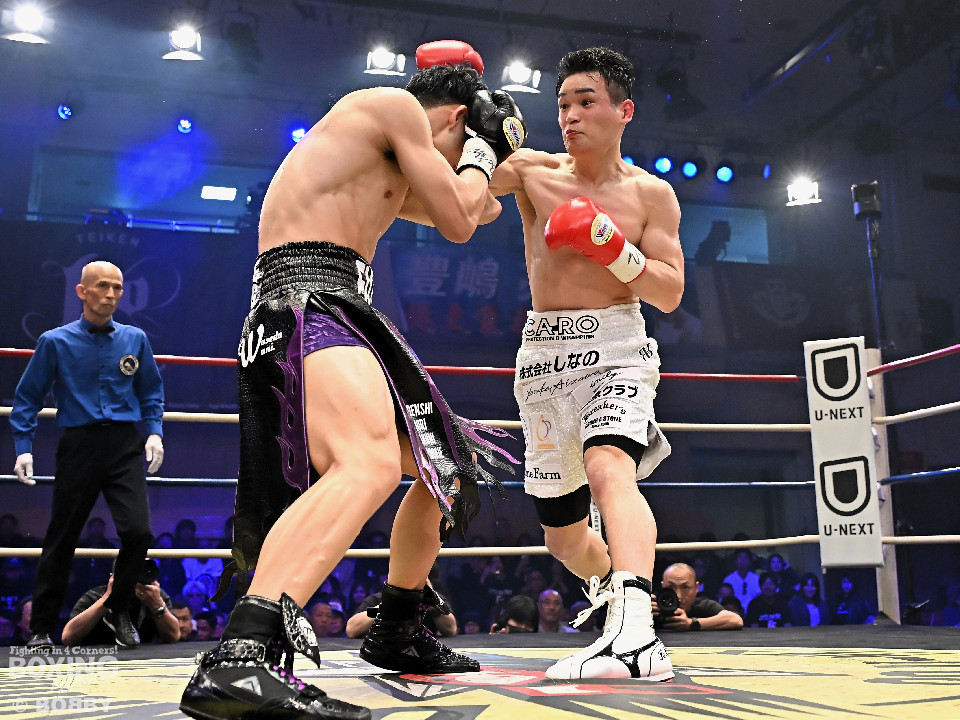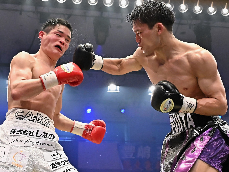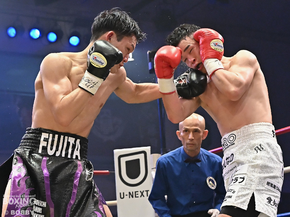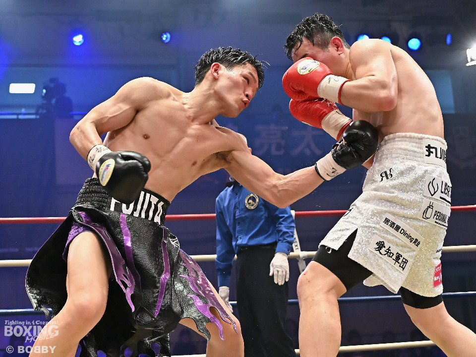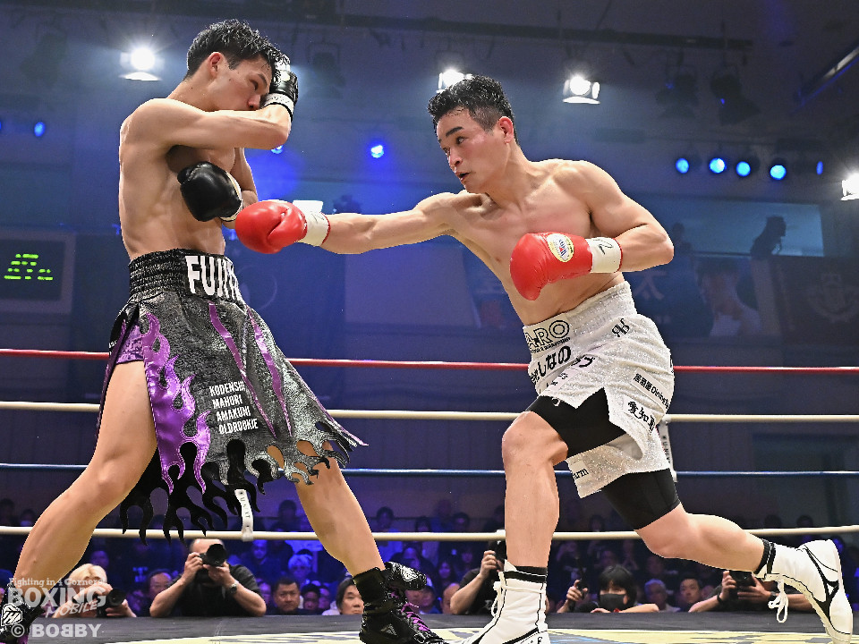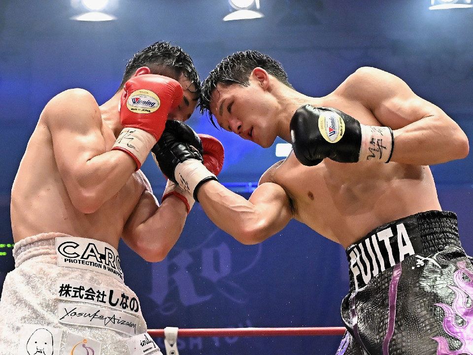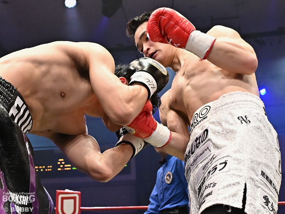 試合:日本スーパーライト級王座決定戦、川村と藤田が11ヶ月ぶりに拳を交えた。先に入場した藤田はリング下で「ウォー!」と気合いを入れてリングイン。続けて入ってきた川村は応援団とグータッチしながら笑顔を見せた。川村がジャブからワンツーを狙うのに対し、藤田はジリジリと距離を詰めて様子を伺うと右フックをブン!初回から緊張感あふれる攻防を繰り広げた。2回、川村は右フックで膝を揺らすが、ここを踏ん張った藤田は右フックでグラつかせて形勢逆転。サウスポーにスイッチするとアッパーを織り交ぜながら攻め立てた。3回、川村は丁寧にジャブを突きながらワンツーをヒット。4回、川村はワンツーでダウンを奪取。再開後、攻め急がずジャブから組み立てた。5回、頭をつけてショートパンチの応酬を見せたかと思えば、ラウンド終盤は中間距離で危険なパンチを交錯させた。前半終了時の公開採点は、48-46×2、49ー45×1で川村がリード。6回、藤田は右ボディストレート、左ボディをコツコツと決めるとプレスをかけてアグレッシブな姿勢。7回、藤田はジャブでリズムを作るとショートアッパーを好打。川村はクリンチで上手く体力の回復に努めた。8回、両応援団が大声援を送る中、藤田のジャブを繰り出せば、川村も一発を狙いスリリングな展開は変わらず。9回、川村がワンツーで顔を弾くとパンチをまとめて攻勢をアピール。10回、最後の力を振り絞り、お互いにブンブンとパンチを振り回し、持てる力を出し切った。採点は割れたが川村を支持。新チャンピオンに輝いた川村は喜びを爆発させ、藤田は天を仰いだ。