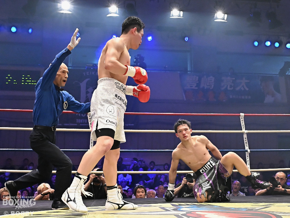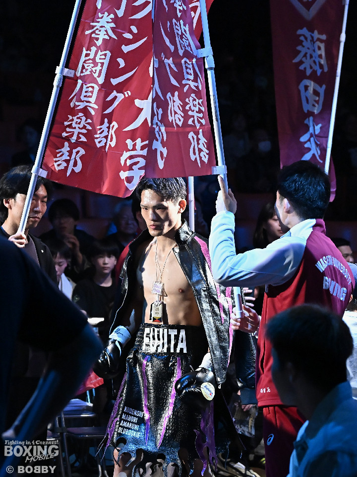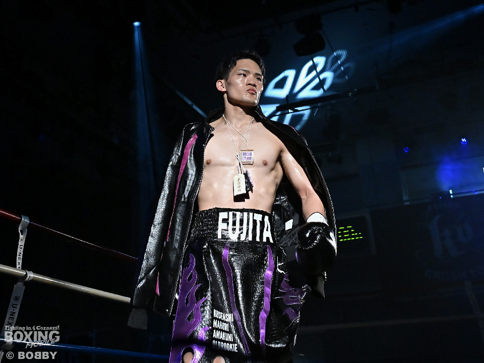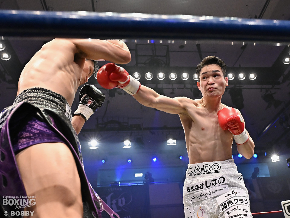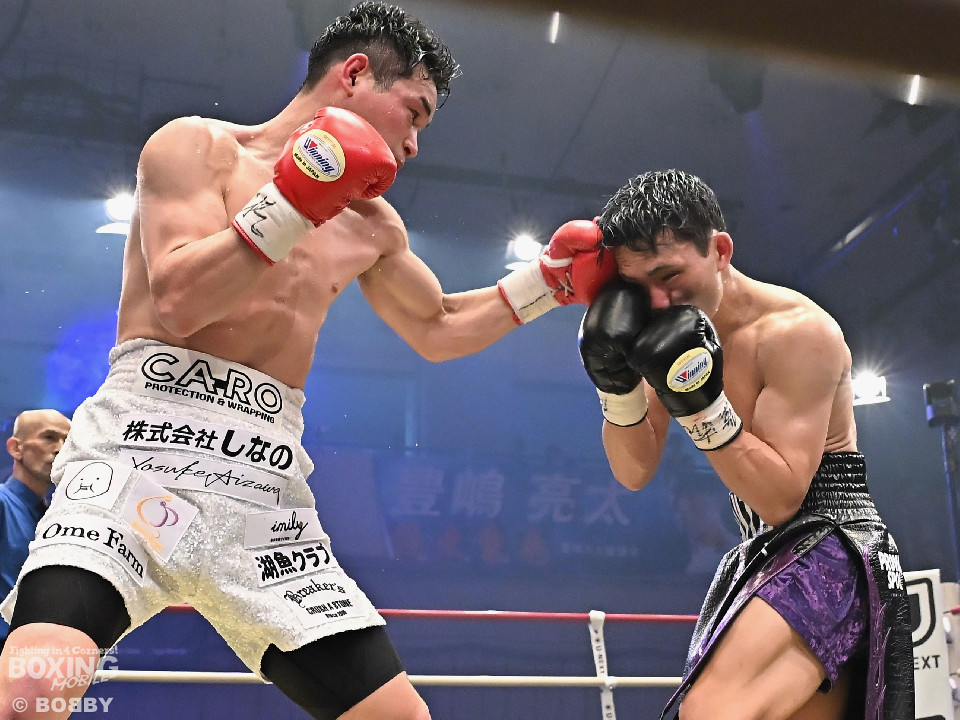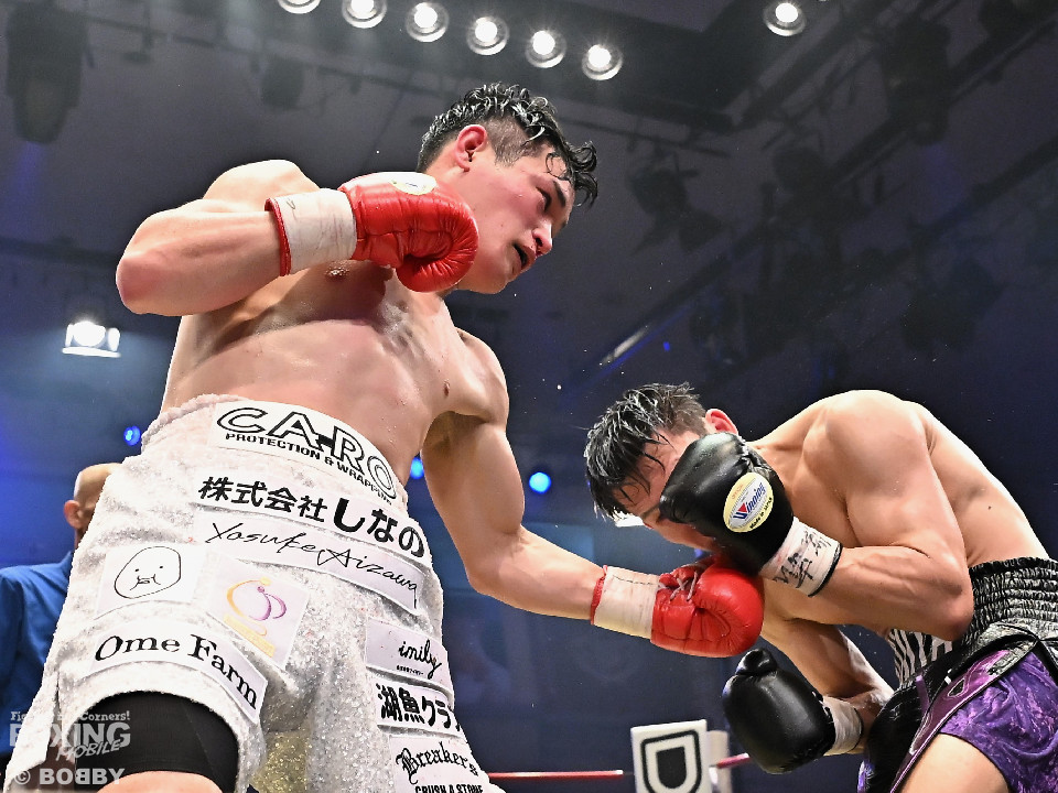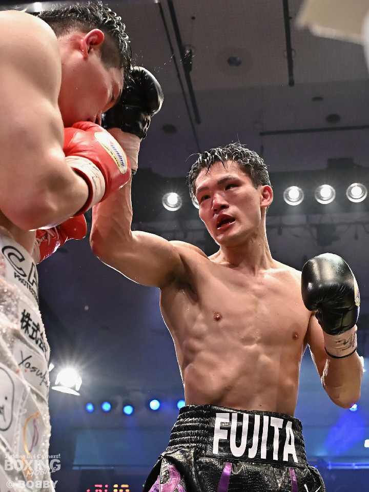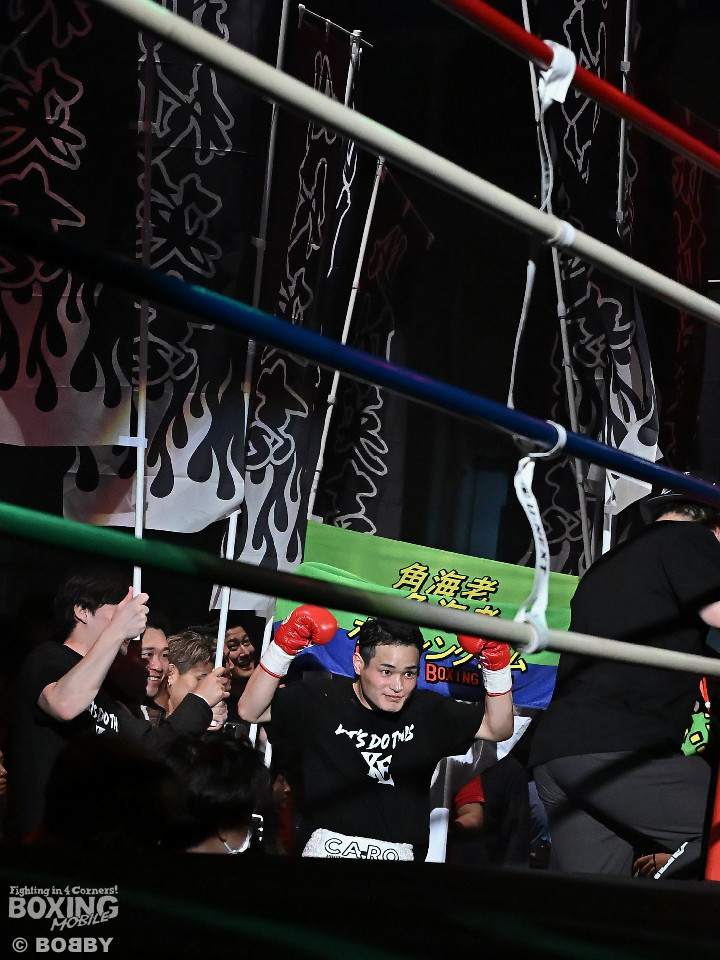 試合:日本スーパーライト級王座決定戦、川村と藤田が11ヶ月ぶりに拳を交えた。先に入場した藤田はリング下で「ウォー!」と気合いを入れてリングイン。続けて入ってきた川村は応援団とグータッチしながら笑顔を見せた。川村がジャブからワンツーを狙うのに対し、藤田はジリジリと距離を詰めて様子を伺うと右フックをブン!初回から緊張感あふれる攻防を繰り広げた。2回、川村は右フックで膝を揺らすが、ここを踏ん張った藤田は右フックでグラつかせて形勢逆転。サウスポーにスイッチするとアッパーを織り交ぜながら攻め立てた。3回、川村は丁寧にジャブを突きながらワンツーをヒット。4回、川村はワンツーでダウンを奪取。再開後、攻め急がずジャブから組み立てた。5回、頭をつけてショートパンチの応酬を見せたかと思えば、ラウンド終盤は中間距離で危険なパンチを交錯させた。前半終了時の公開採点は、48-46×2、49ー45×1で川村がリード。6回、藤田は右ボディストレート、左ボディをコツコツと決めるとプレスをかけてアグレッシブな姿勢。7回、藤田はジャブでリズムを作るとショートアッパーを好打。川村はクリンチで上手く体力の回復に努めた。8回、両応援団が大声援を送る中、藤田のジャブを繰り出せば、川村も一発を狙いスリリングな展開は変わらず。9回、川村がワンツーで顔を弾くとパンチをまとめて攻勢をアピール。10回、最後の力を振り絞り、お互いにブンブンとパンチを振り回し、持てる力を出し切った。採点は割れたが川村を支持。新チャンピオンに輝いた川村は喜びを爆発させ、藤田は天を仰いだ。