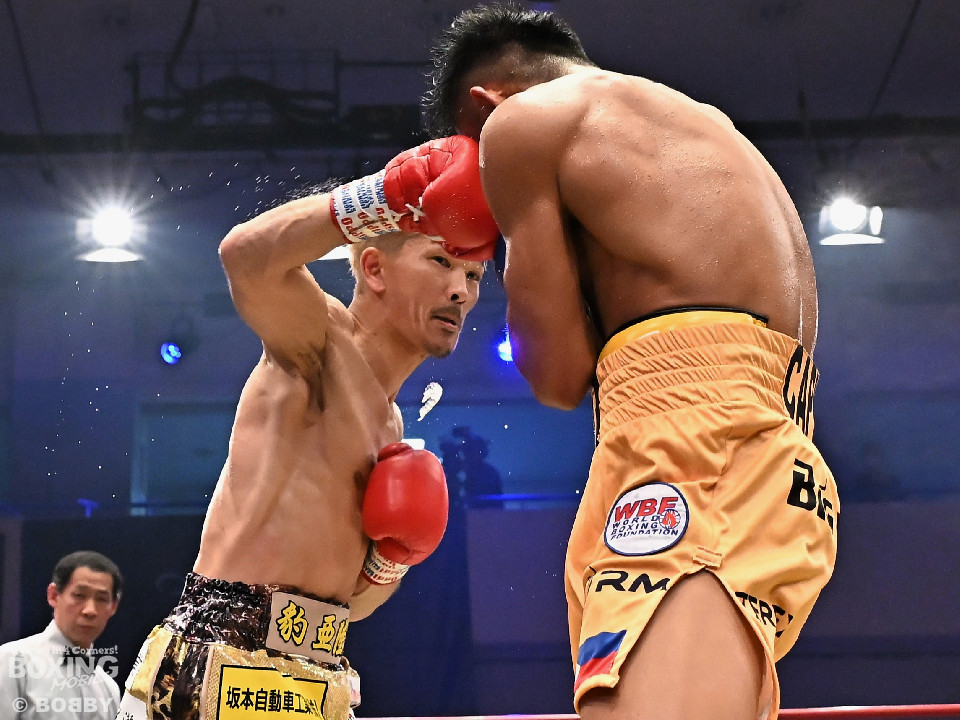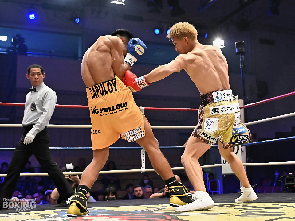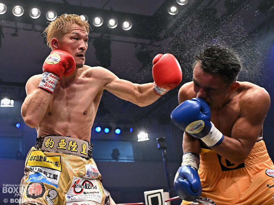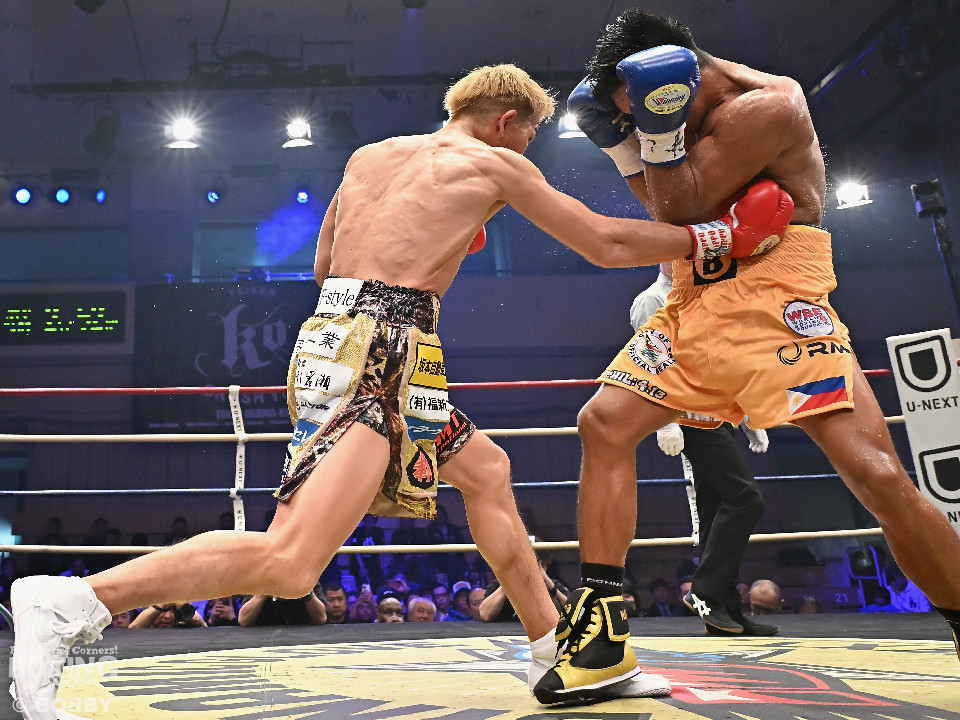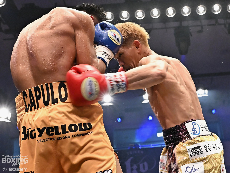 試合:元IBF世界スーパーフェザー級王者の尾川がメインイベントに登場。尾川がプレスをかけて右ストレート、左ボディを好打。積極的な攻撃で初回からペースを握った。2回、サウスポー・カプロイの左をバックステップで対応した尾川は、左ボディ、ワンツーをヒット。3回、尾川は突っ込みながら左ストレートを繰り出す相手に手を焼いた。4回、カプロイは独特のリズムから左オーバーハンドをねじ込み反撃。一瞬、ヒヤリとさせたが右ボディストレートを突き刺した。6回、尾川は右ボディストレート、ワンツーで突き放した。偶然のバッティングで尾川は左目上をカット。8回、ワンツーを叩き込む尾川だが、カプロイは前進を止めず左ボディストレートを突き刺し意地を見せた。9回、カプロイはリターンの左フックで顔を弾き反撃。10回、尾川はワンツーを軸に積極的な攻撃でジャッジに攻勢をアピールした。相手のラフファイトに手を焼いた尾川だが大差判定勝ちを飾った。