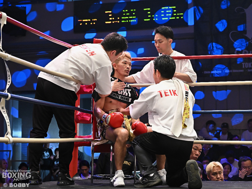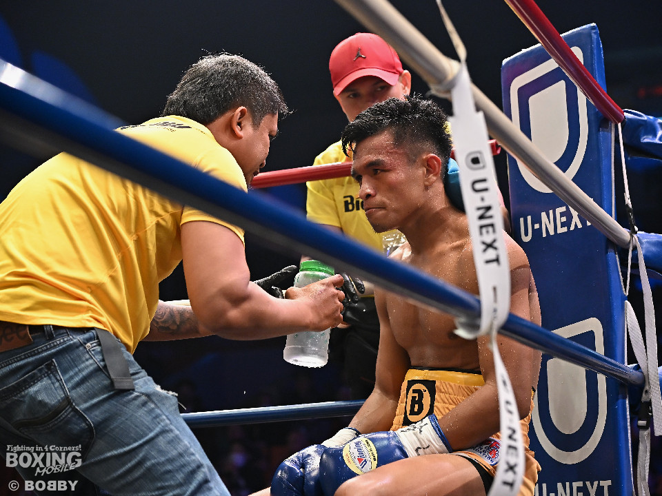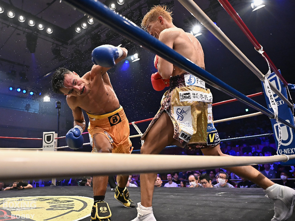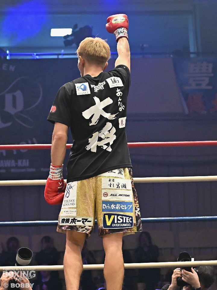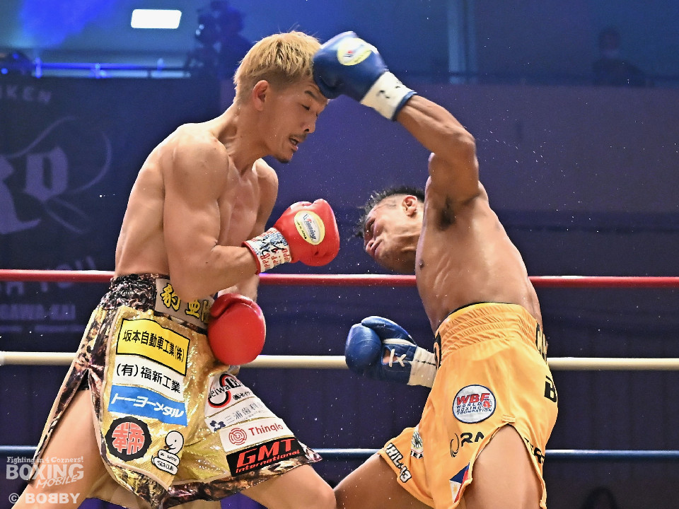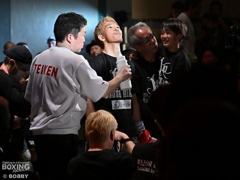 試合:元IBF世界スーパーフェザー級王者の尾川がメインイベントに登場。尾川がプレスをかけて右ストレート、左ボディを好打。積極的な攻撃で初回からペースを握った。2回、サウスポー・カプロイの左をバックステップで対応した尾川は、左ボディ、ワンツーをヒット。3回、尾川は突っ込みながら左ストレートを繰り出す相手に手を焼いた。4回、カプロイは独特のリズムから左オーバーハンドをねじ込み反撃。一瞬、ヒヤリとさせたが右ボディストレートを突き刺した。6回、尾川は右ボディストレート、ワンツーで突き放した。偶然のバッティングで尾川は左目上をカット。8回、ワンツーを叩き込む尾川だが、カプロイは前進を止めず左ボディストレートを突き刺し意地を見せた。9回、カプロイはリターンの左フックで顔を弾き反撃。10回、尾川はワンツーを軸に積極的な攻撃でジャッジに攻勢をアピールした。相手のラフファイトに手を焼いた尾川だが大差判定勝ちを飾った。