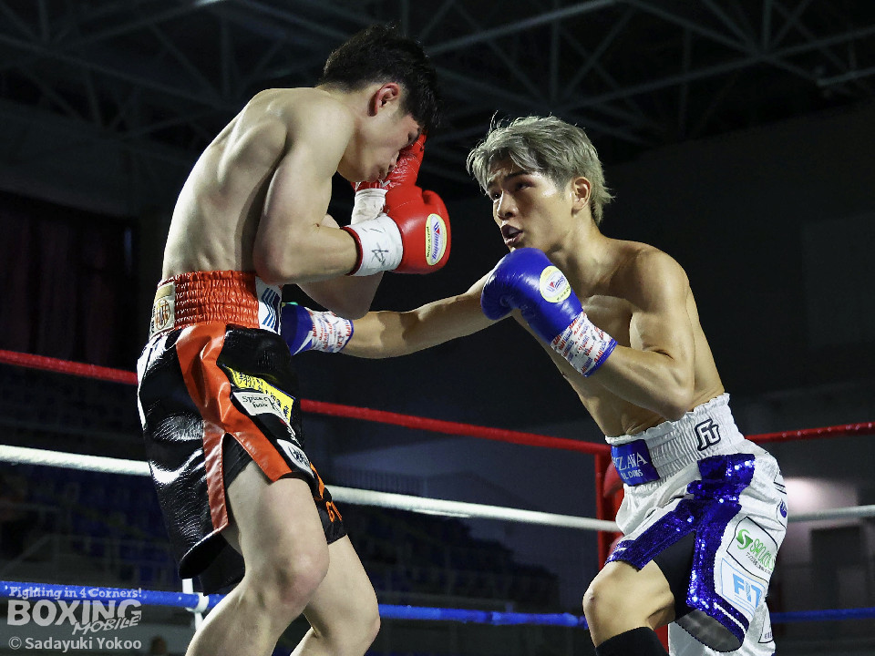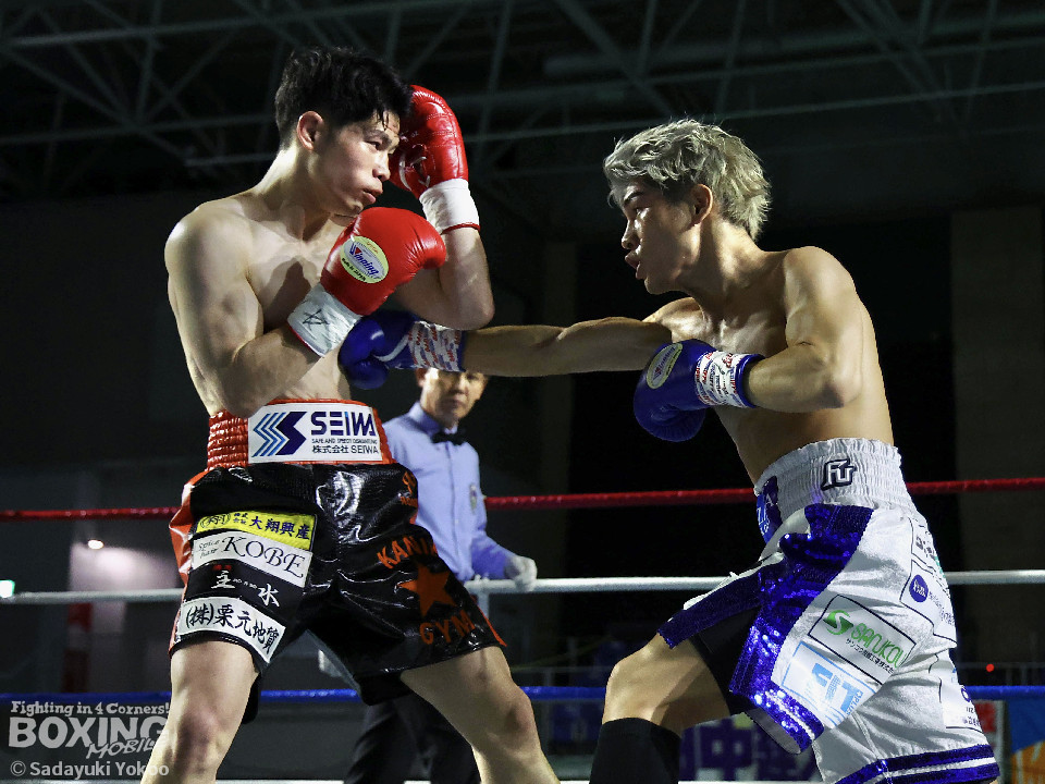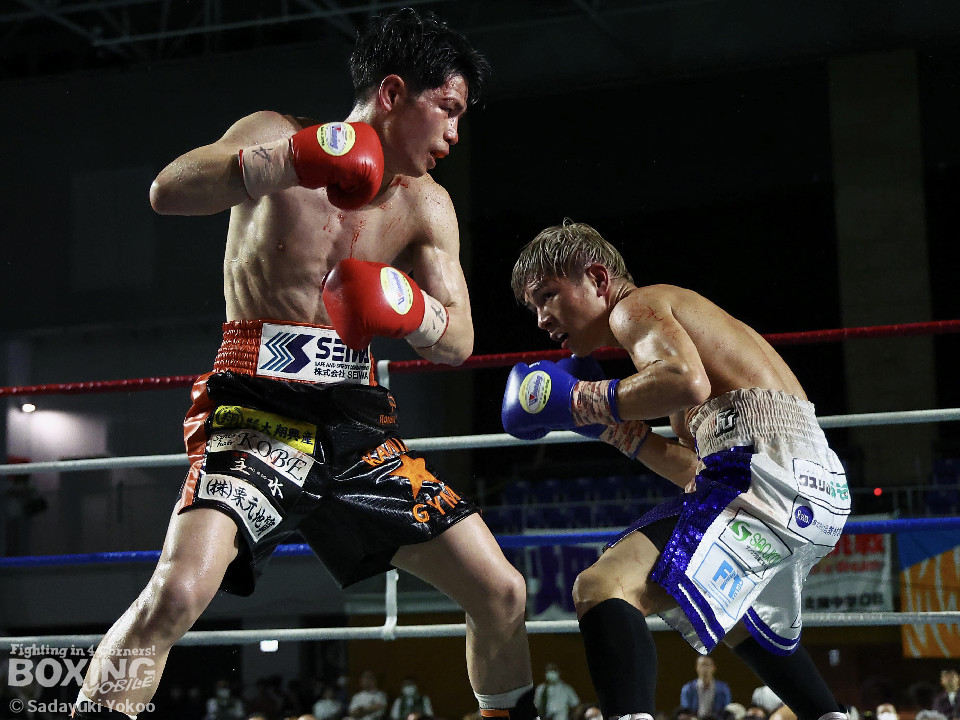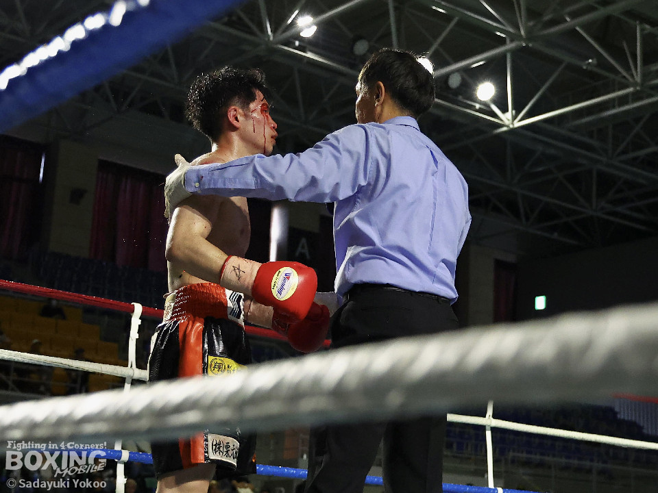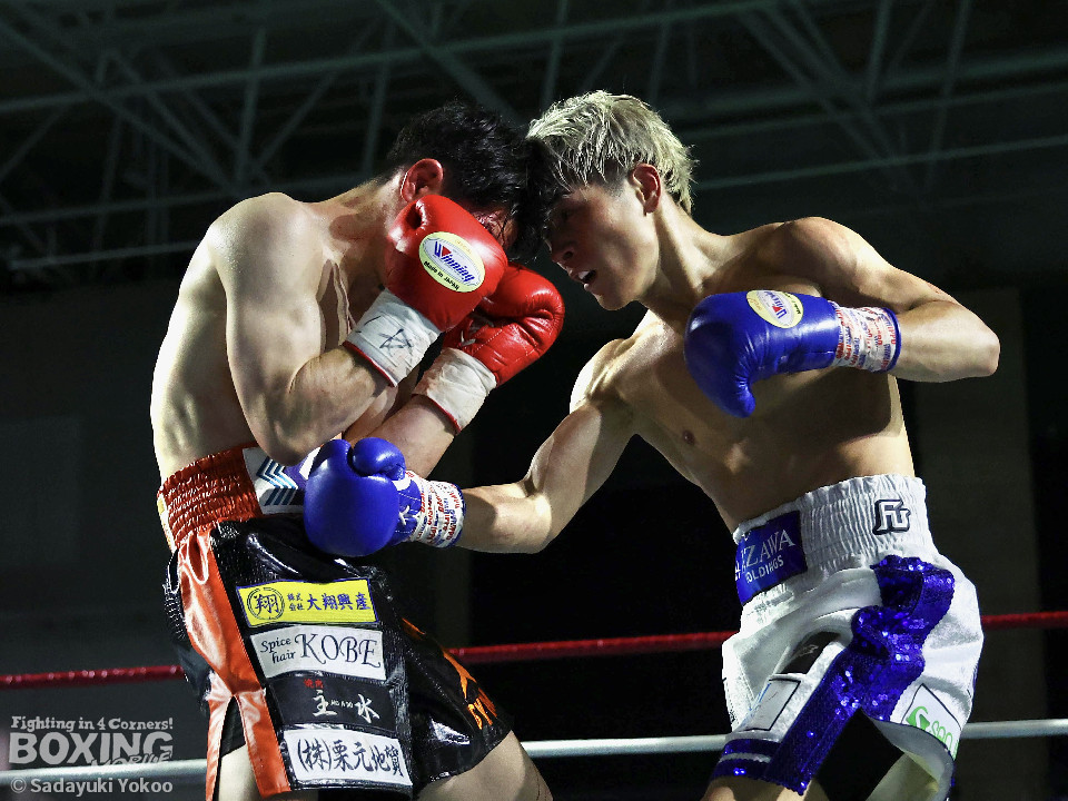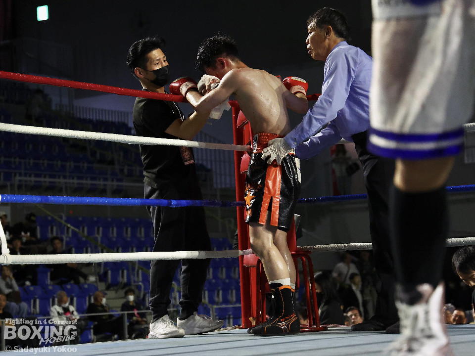 試合:犬塚が右オーバーハンドを叩きつけると左右フックを叩きつけて先制攻撃。後手に回った近藤だが、ガードで被弾を押さえると右ボディストレートを返した。2回、犬塚はワンツーを好打するとサイドに回り込み見栄えの良さをアピール。3回、犬塚は上下に打ち分け積極的な攻撃。偶然のバッティングで近藤は左目上をカット。ラウンド終盤、近藤はコーナーに押し込むと左ボディを叩きつけて意地を見せた。4回、近藤は右ショートで膝を揺らすとアグレッシブな姿勢。5回、回転力を活かした連打で激しいパンチの交換。近藤の有効打が上回った印象。6回、手数を増やした犬塚だが近藤は前の手で対応。7回、近藤が右フックをねじ込むとギアを上げて攻勢を印象付けた。8回、火が出るような打ち合いの中、犬塚がなりふり構わず手数を増やして攻勢。右フックで倒れた近藤を見てレフェリーはダウンを宣告。立ち上った近藤だがレフェリーは10カウントを数え上げた。激戦を制した犬塚が昨年8月以来の再起戦を飾った。