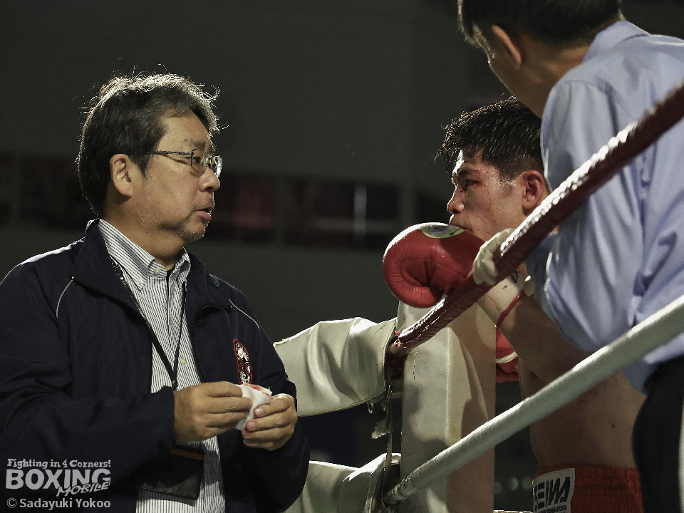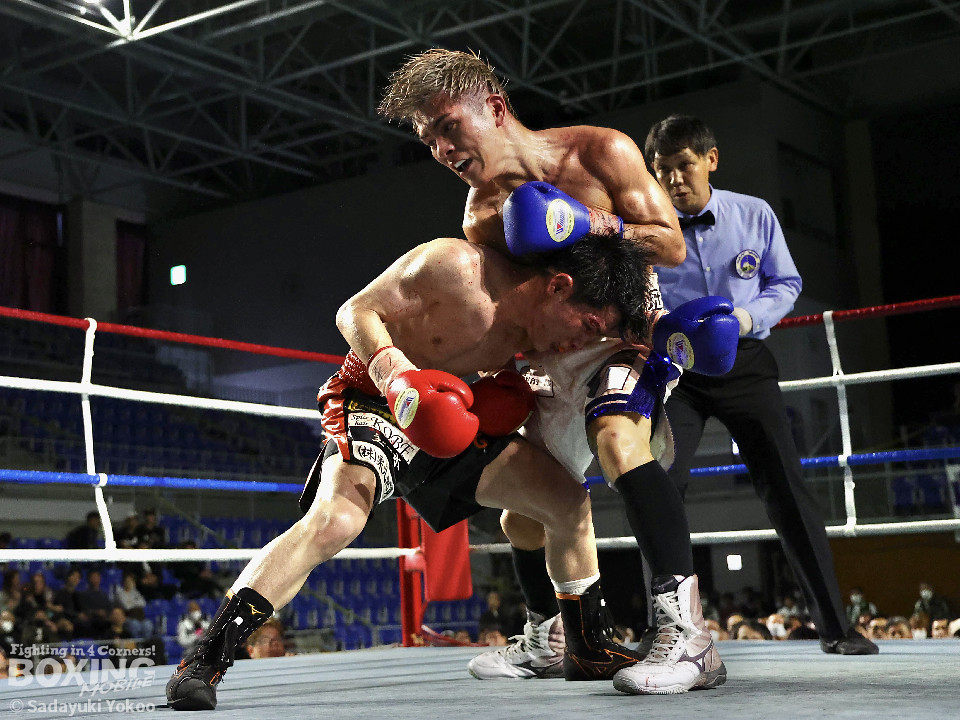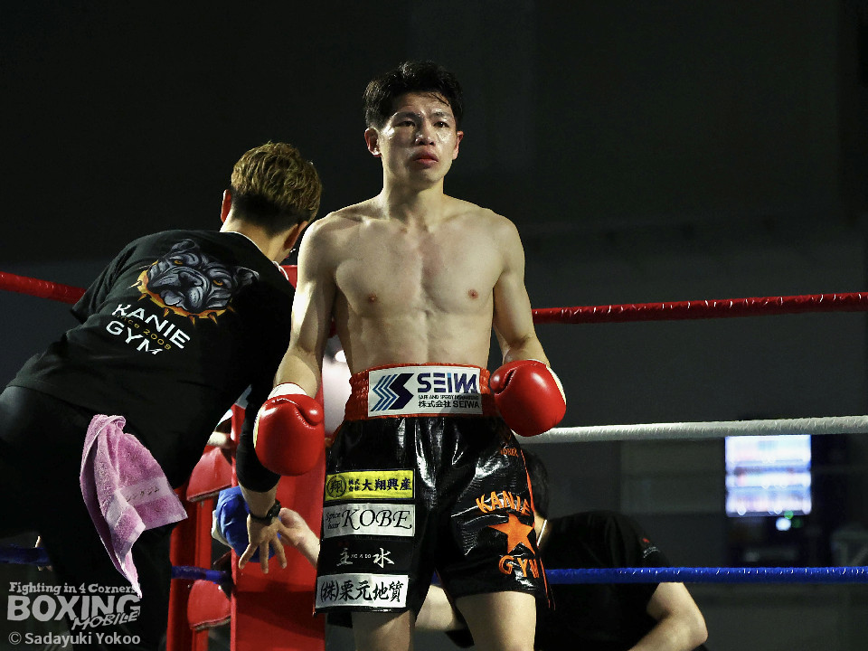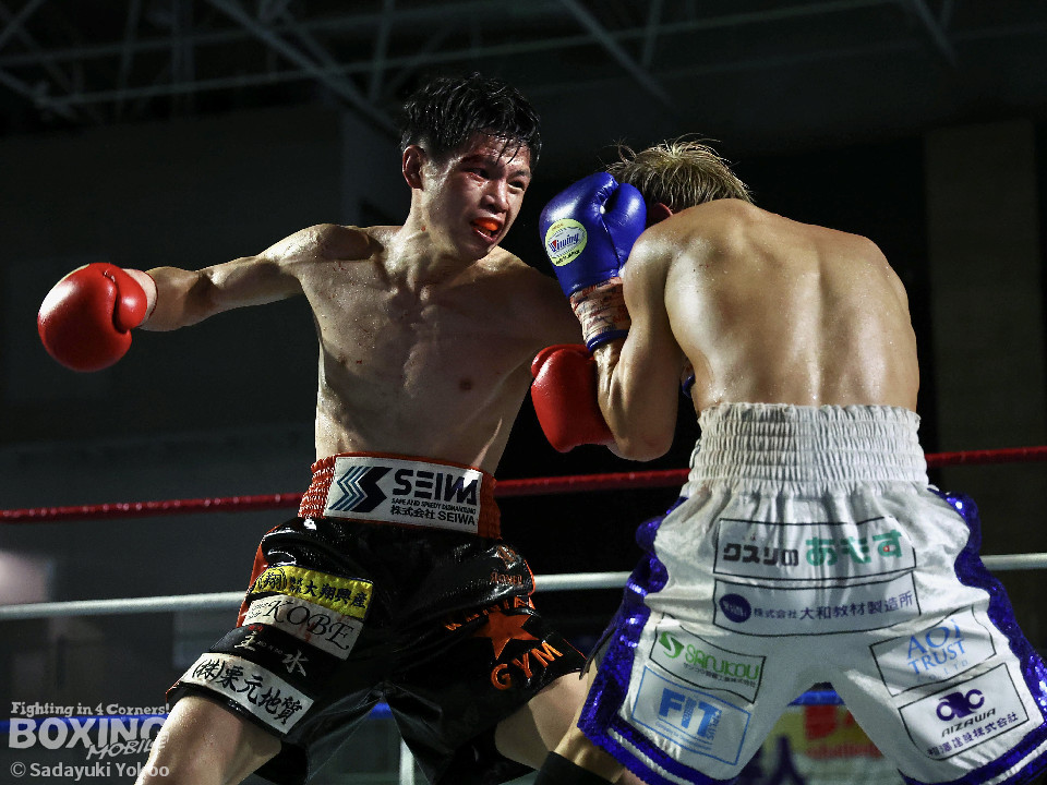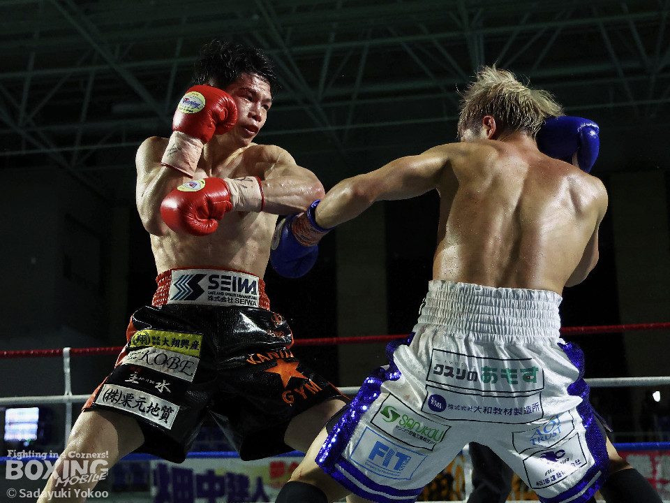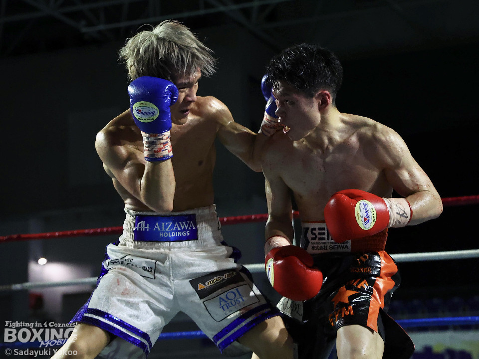 試合:犬塚が右オーバーハンドを叩きつけると左右フックを叩きつけて先制攻撃。後手に回った近藤だが、ガードで被弾を押さえると右ボディストレートを返した。2回、犬塚はワンツーを好打するとサイドに回り込み見栄えの良さをアピール。3回、犬塚は上下に打ち分け積極的な攻撃。偶然のバッティングで近藤は左目上をカット。ラウンド終盤、近藤はコーナーに押し込むと左ボディを叩きつけて意地を見せた。4回、近藤は右ショートで膝を揺らすとアグレッシブな姿勢。5回、回転力を活かした連打で激しいパンチの交換。近藤の有効打が上回った印象。6回、手数を増やした犬塚だが近藤は前の手で対応。7回、近藤が右フックをねじ込むとギアを上げて攻勢を印象付けた。8回、火が出るような打ち合いの中、犬塚がなりふり構わず手数を増やして攻勢。右フックで倒れた近藤を見てレフェリーはダウンを宣告。立ち上った近藤だがレフェリーは10カウントを数え上げた。激戦を制した犬塚が昨年8月以来の再起戦を飾った。