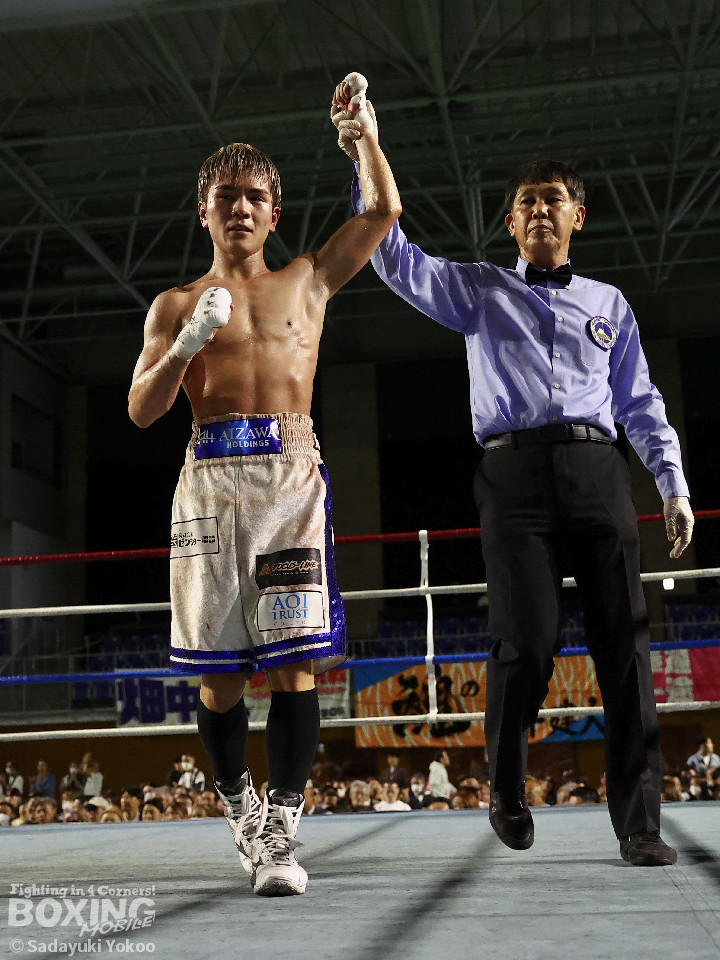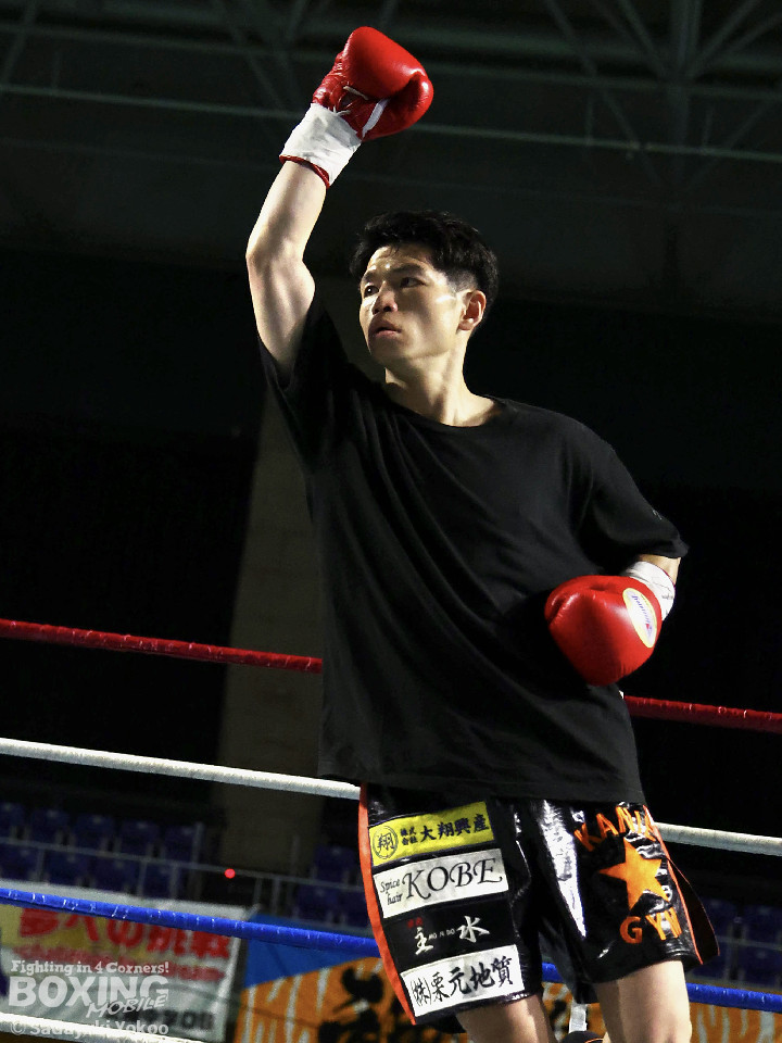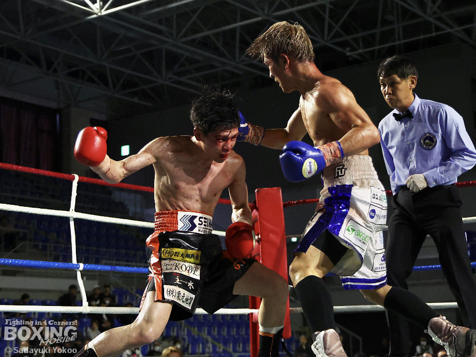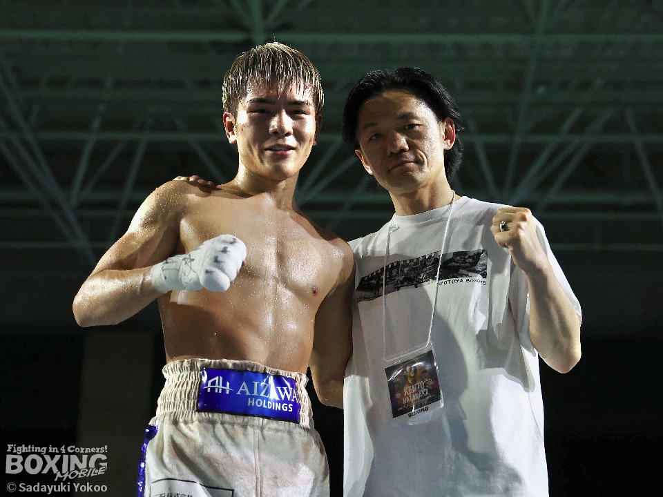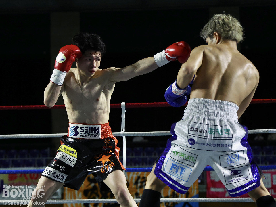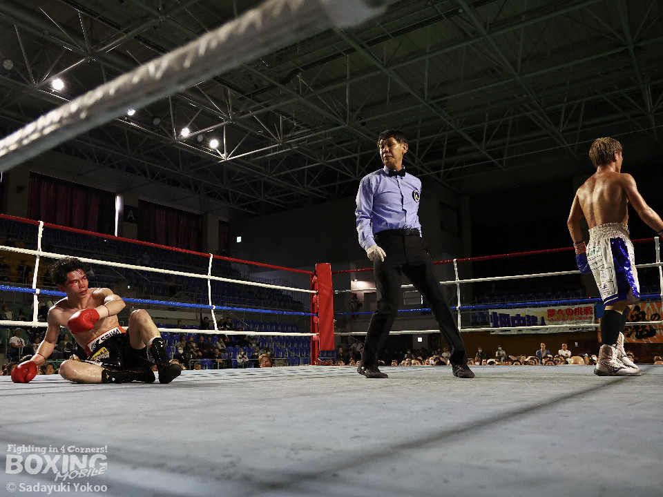 試合:犬塚が右オーバーハンドを叩きつけると左右フックを叩きつけて先制攻撃。後手に回った近藤だが、ガードで被弾を押さえると右ボディストレートを返した。2回、犬塚はワンツーを好打するとサイドに回り込み見栄えの良さをアピール。3回、犬塚は上下に打ち分け積極的な攻撃。偶然のバッティングで近藤は左目上をカット。ラウンド終盤、近藤はコーナーに押し込むと左ボディを叩きつけて意地を見せた。4回、近藤は右ショートで膝を揺らすとアグレッシブな姿勢。5回、回転力を活かした連打で激しいパンチの交換。近藤の有効打が上回った印象。6回、手数を増やした犬塚だが近藤は前の手で対応。7回、近藤が右フックをねじ込むとギアを上げて攻勢を印象付けた。8回、火が出るような打ち合いの中、犬塚がなりふり構わず手数を増やして攻勢。右フックで倒れた近藤を見てレフェリーはダウンを宣告。立ち上った近藤だがレフェリーは10カウントを数え上げた。激戦を制した犬塚が昨年8月以来の再起戦を飾った。
