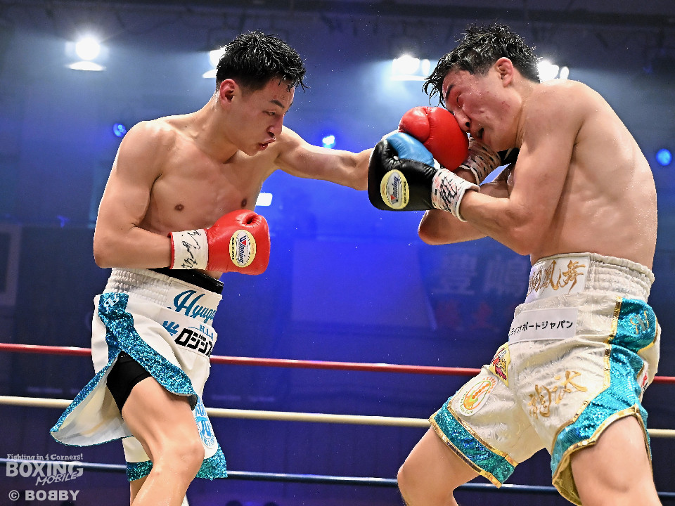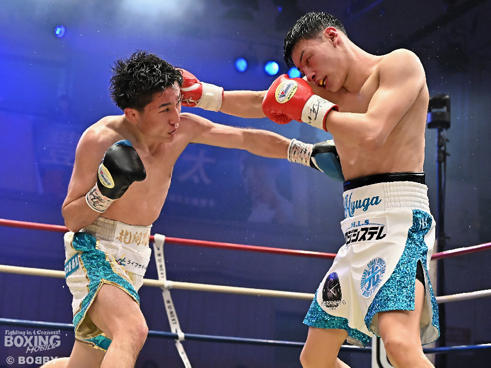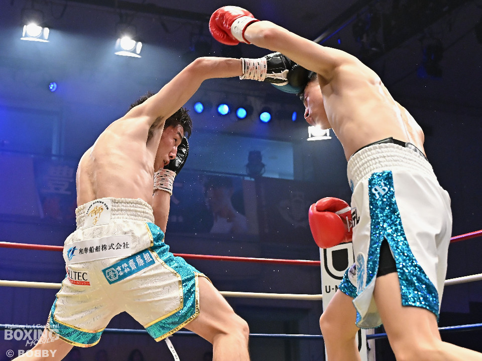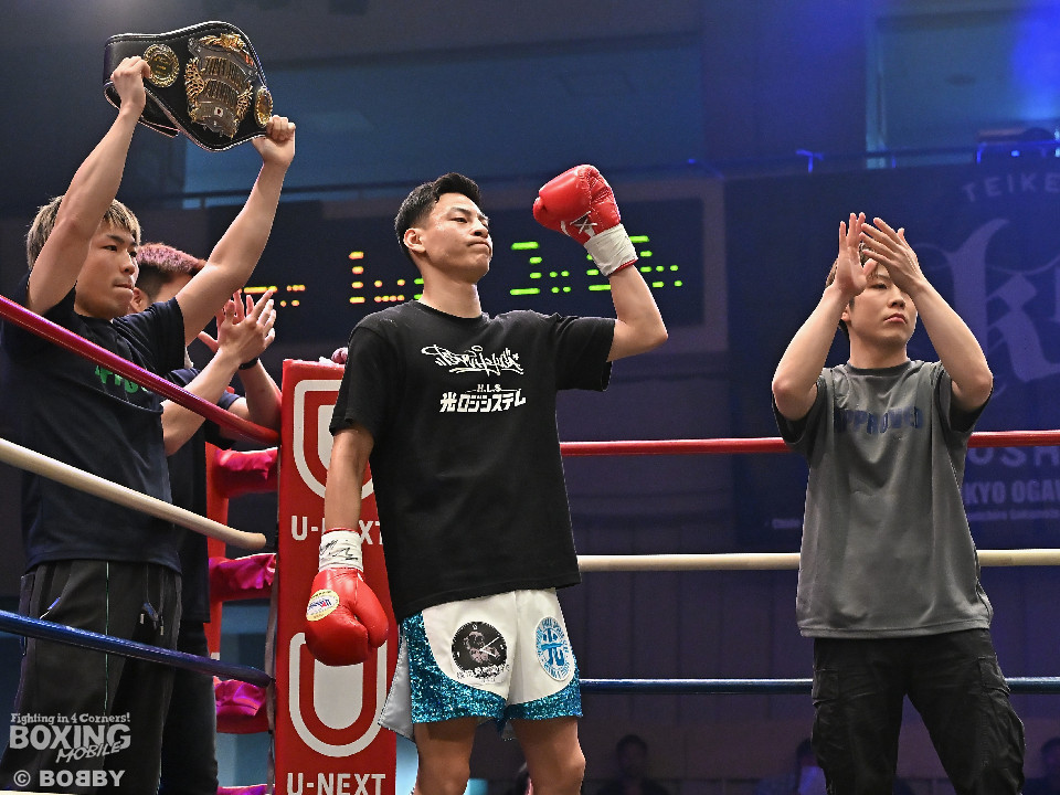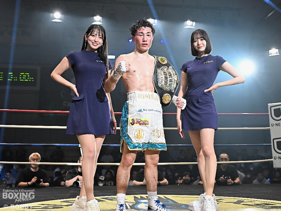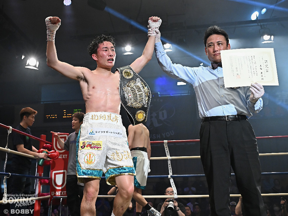 試合:日本ユース・ライトフライ級王者の大木がライオンズジムのホープ末國を迎え撃った。サウスポー同士の一戦は、ジャブの差し合いからスタート。末國の左クロスが浅くヒット。2回、神経戦が続きお互いにクリーンヒットが奪えず。3回、末國はリターンの右フックを決めると出入りを意識しながらテンポアップ。4回、大木はステップインからのワンツーを好打。ガードで決定打を回避した末國だがこのラウンドは大木が優勢。前半終了時の公開採点は、三者三様。6回、大木は距離を潰してボディ攻撃で体力を削る作戦。7回、末國はインサイドからのショートアッパーで見栄えの良さをアピール。ラウンド終盤は左ストレートを交錯させて会場を盛り上げた。8回、末國は右フックをねじ込むと返しのパンチをボディワークで回避した。ジャッジ2者の支持を得た末國が2戦目で新チャンピオンに輝いた。