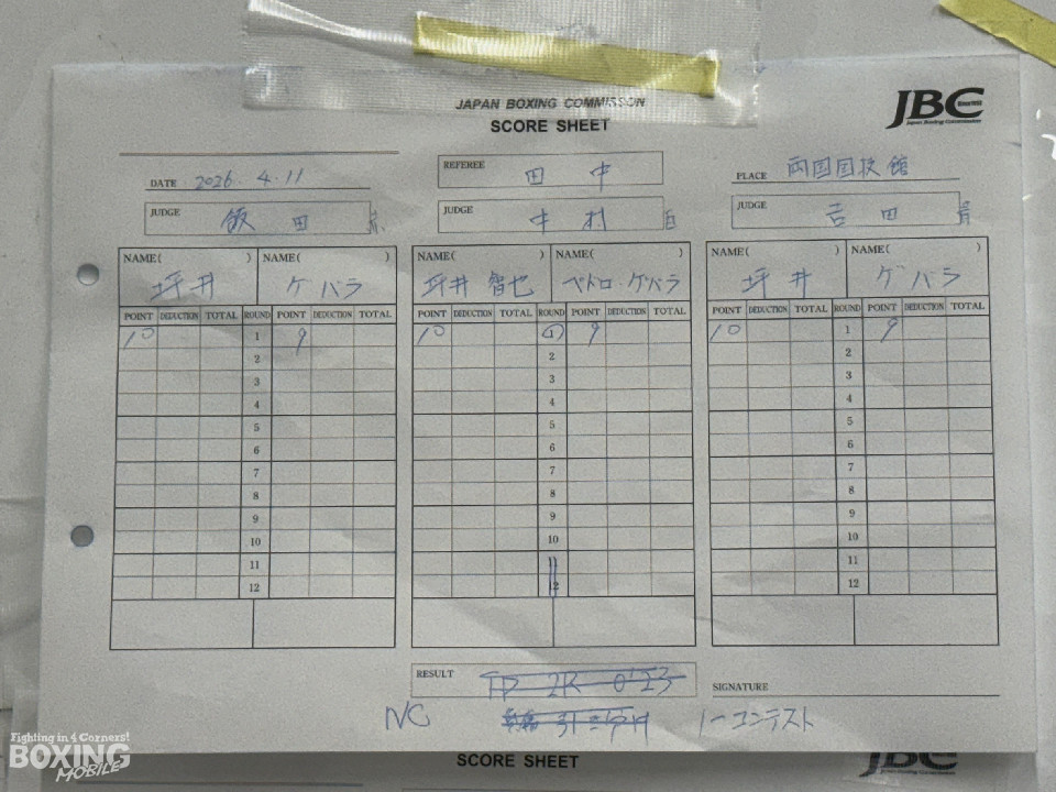 試合:WBC世界スーパーフライ級1位の坪井が元世界王者のゲバラと拳を交えた。坪井が緩急をつけたジャブを上下に散らして距離とタイミングを探る。2回、頭がぶつかるとゲバラはキャンバスに倒れ込む。ダメージが深くこれ以上の試合続行を不能としたレフェリーは試合をストップ。ゲバラは担架で運び出された。既定のラウンドに達していないため負傷引き分けとなった。その後、JBCよりノーコンテストの発表があった。