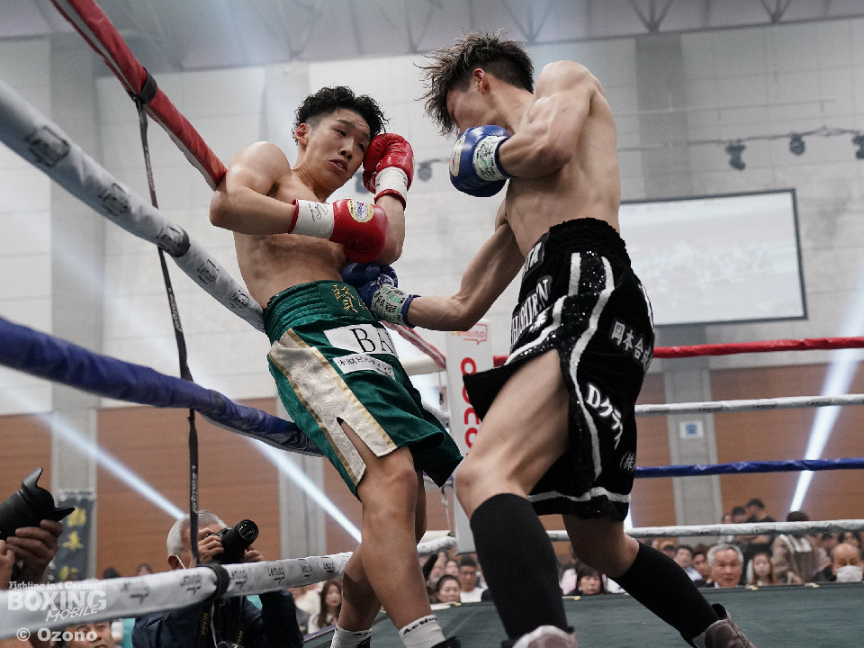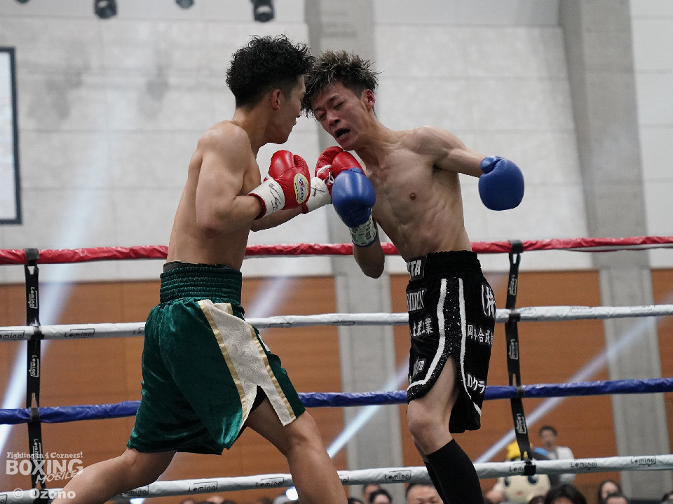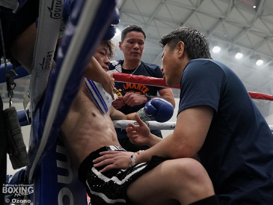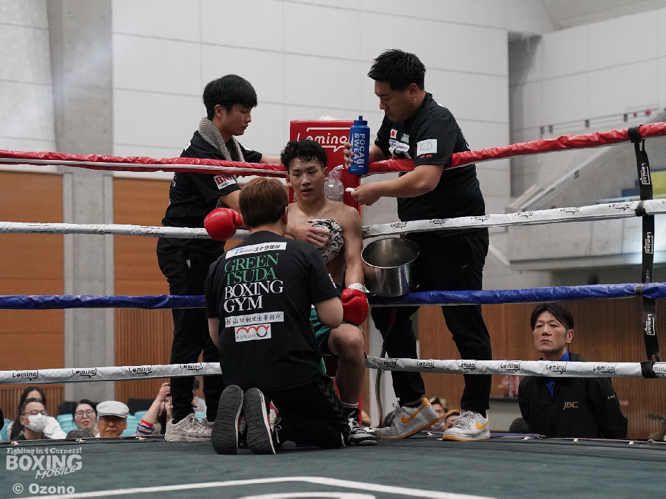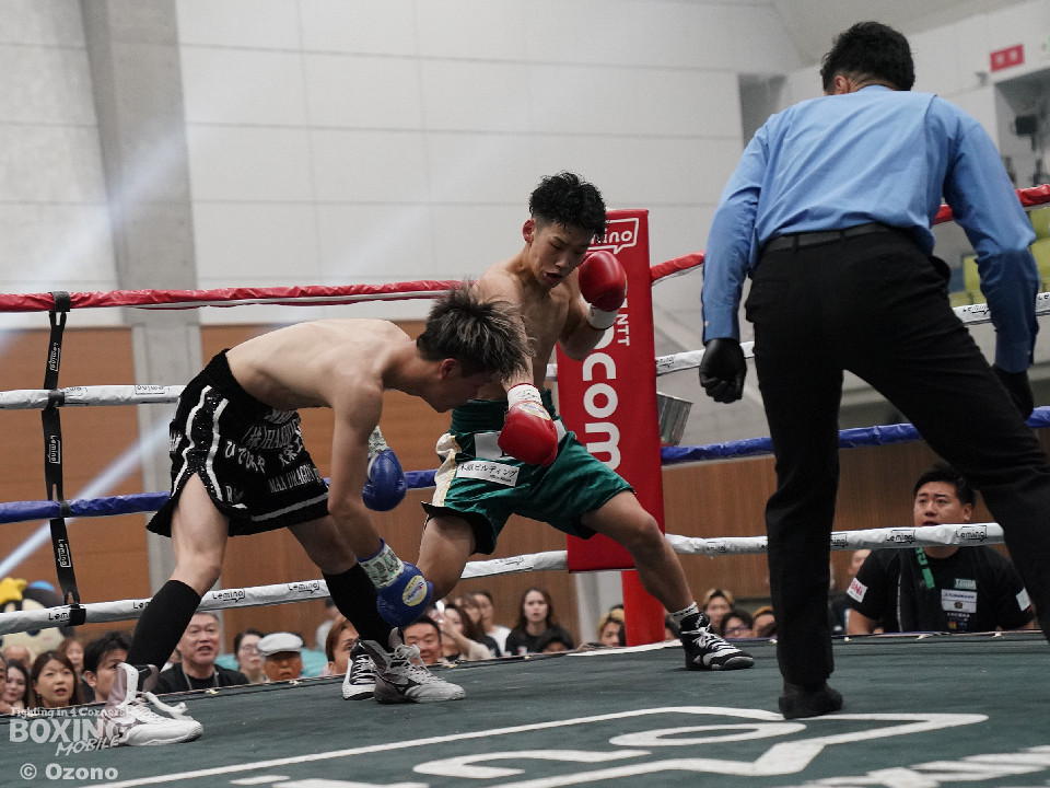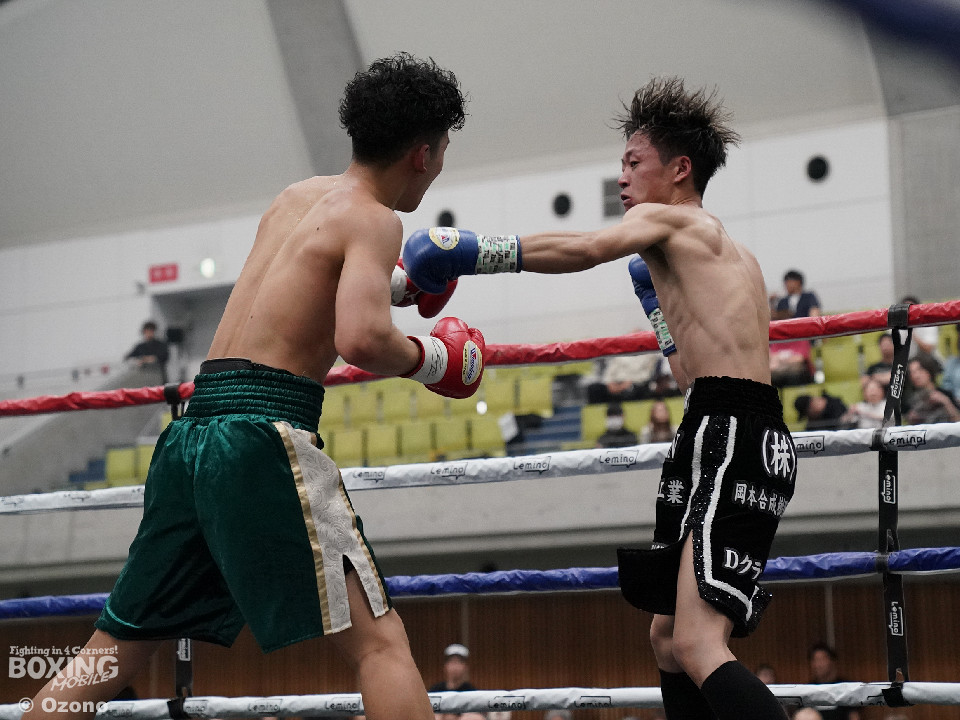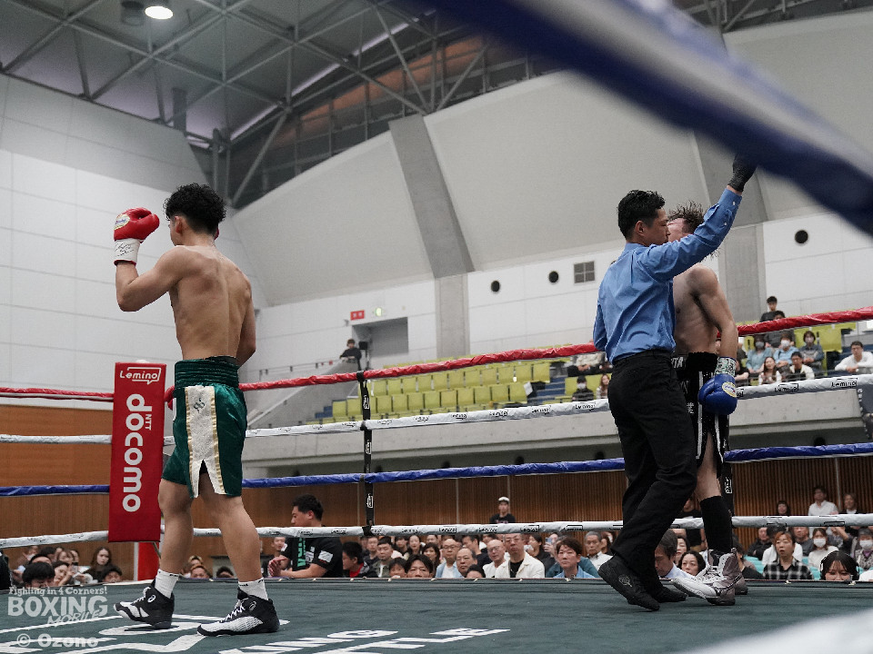試合:福本が右から切り込むが、サウスポー高岡は左ショートで腰を沈めさせるとパンチをまとめて積極的な攻撃。ラウンド終了間際に左フックでグラつかせて攻勢を印象付けた。2回、福本は右ストレートで顔を弾くが、高岡は倍返しでペースを渡さず。勝負が決まったのは3回、高岡はチャンスを逃さずラッシュすると防戦一方になった福本を見てレフェリーが割って入った。