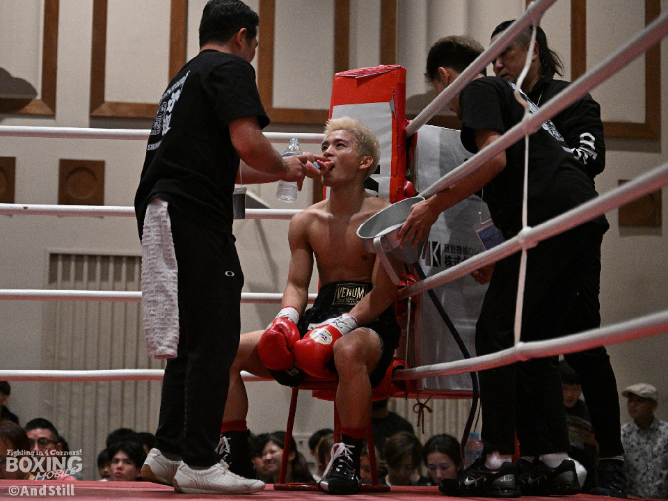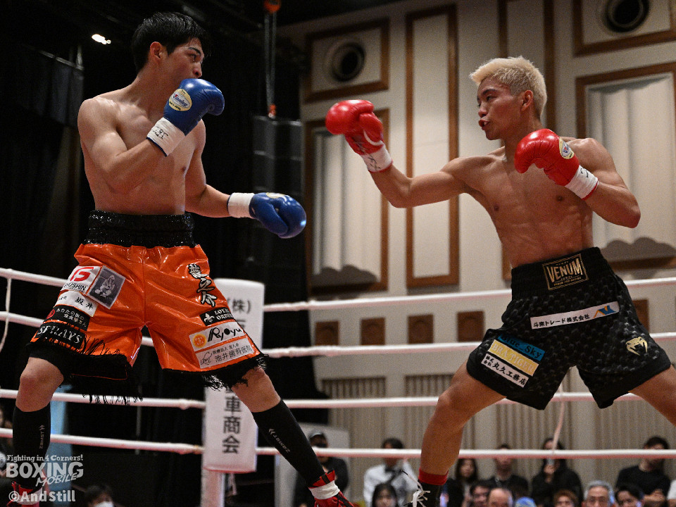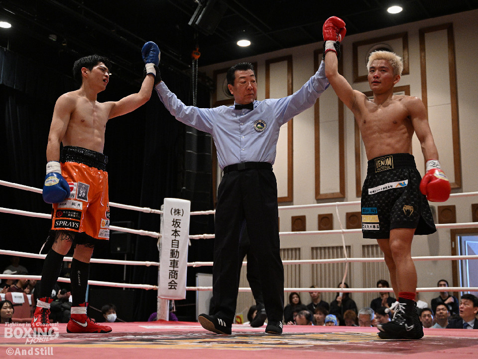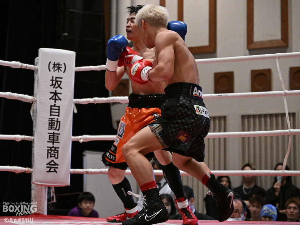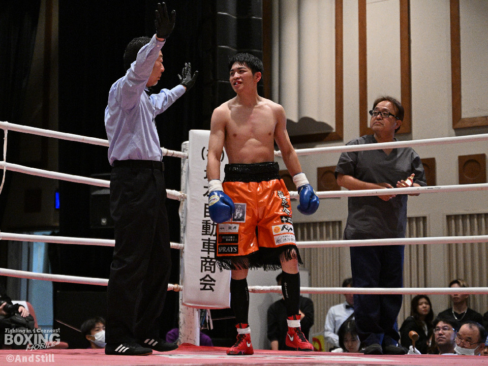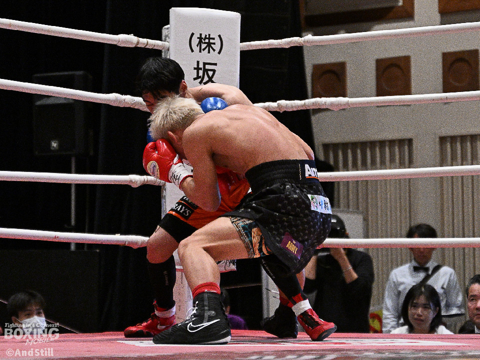 試合:サウスポー宮里がボディにジャブを伸ばすと左カウンターで相手をリングに一回転させた。再開後、ワンツーを好打するとラウンド終盤に左ストレートで膝を折り、パンチをまとめて攻勢を印象つけた。2回、坂下は右ストレートを狙うが、宮里は左ストレートをヒット。偶然のバッティングで坂下は左目を負傷。ドクターチェックの上、試合続行不能となりストップした。既定のラウンドに達していないため、引き分けとなったが新人王特別ルールにより優勢点を勝ち取った宮里が次戦に進んだ。