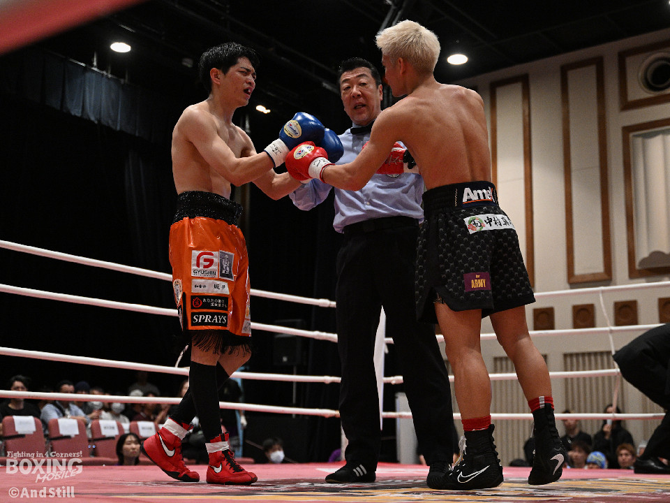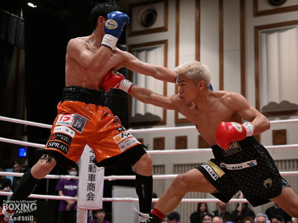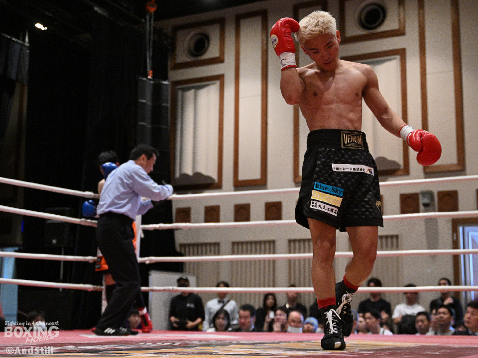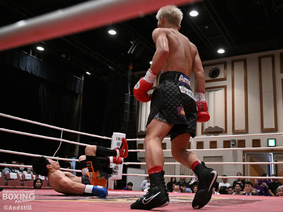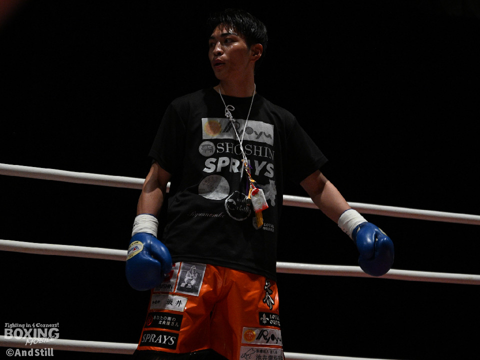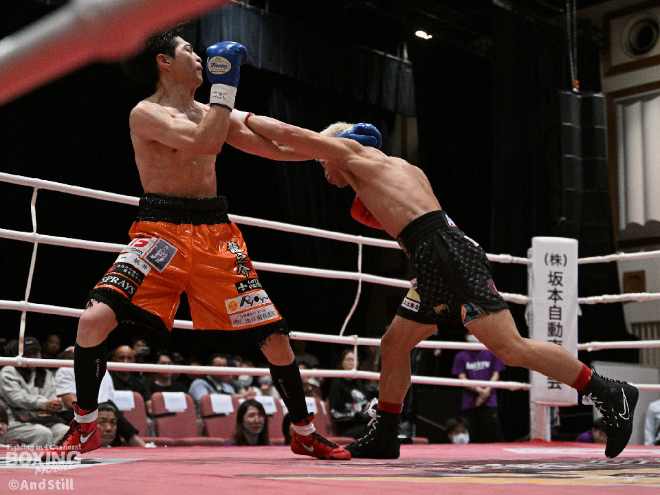 試合:サウスポー宮里がボディにジャブを伸ばすと左カウンターで相手をリングに一回転させた。再開後、ワンツーを好打するとラウンド終盤に左ストレートで膝を折り、パンチをまとめて攻勢を印象つけた。2回、坂下は右ストレートを狙うが、宮里は左ストレートをヒット。偶然のバッティングで坂下は左目を負傷。ドクターチェックの上、試合続行不能となりストップした。既定のラウンドに達していないため、引き分けとなったが新人王特別ルールにより優勢点を勝ち取った宮里が次戦に進んだ。