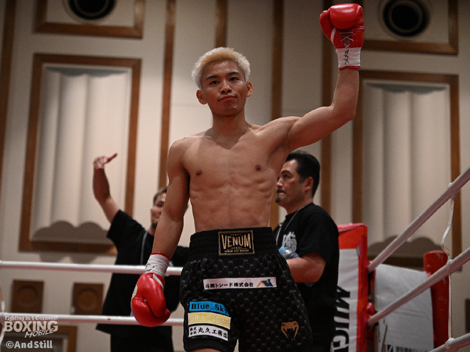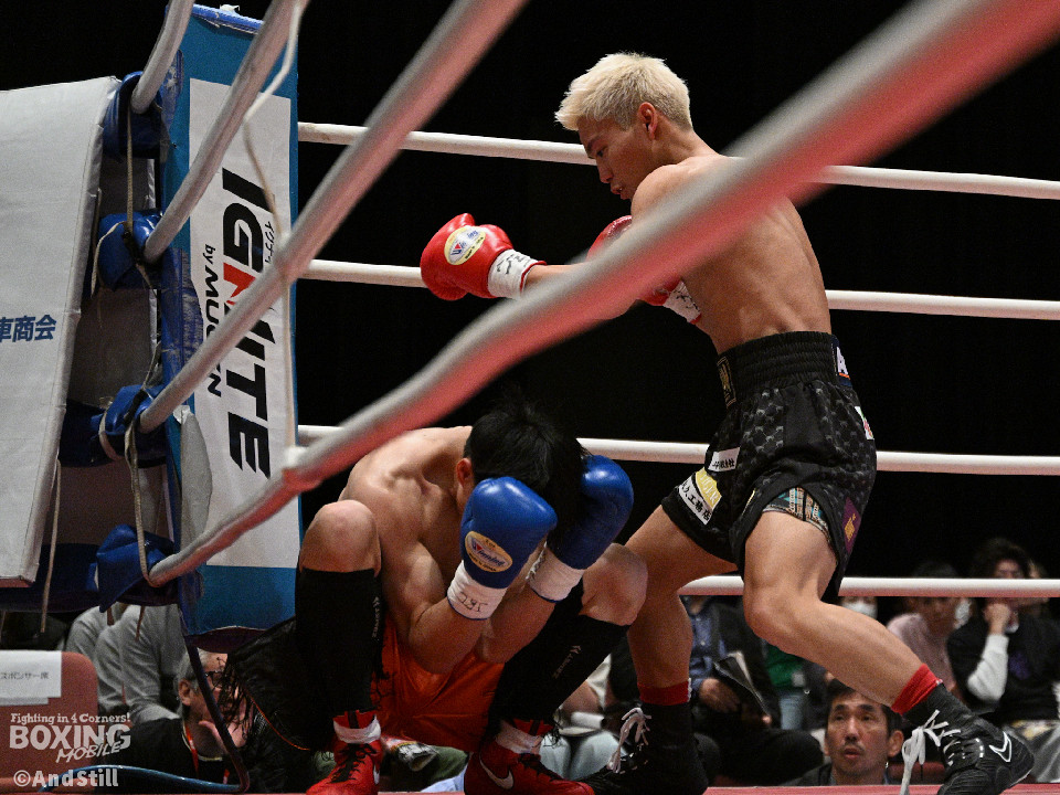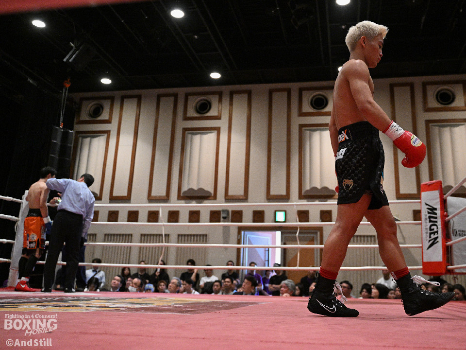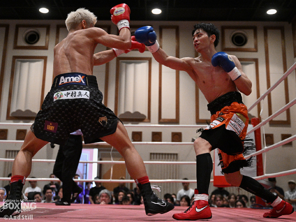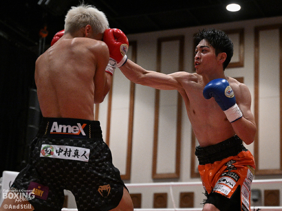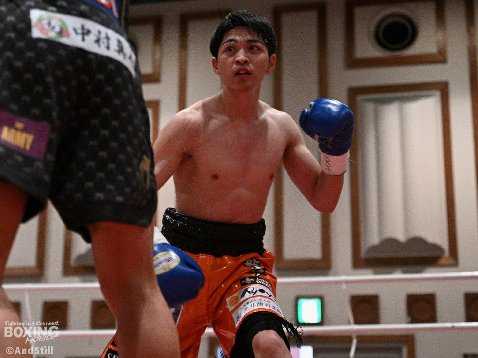 試合:サウスポー宮里がボディにジャブを伸ばすと左カウンターで相手をリングに一回転させた。再開後、ワンツーを好打するとラウンド終盤に左ストレートで膝を折り、パンチをまとめて攻勢を印象つけた。2回、坂下は右ストレートを狙うが、宮里は左ストレートをヒット。偶然のバッティングで坂下は左目を負傷。ドクターチェックの上、試合続行不能となりストップした。既定のラウンドに達していないため、引き分けとなったが新人王特別ルールにより優勢点を勝ち取った宮里が次戦に進んだ。