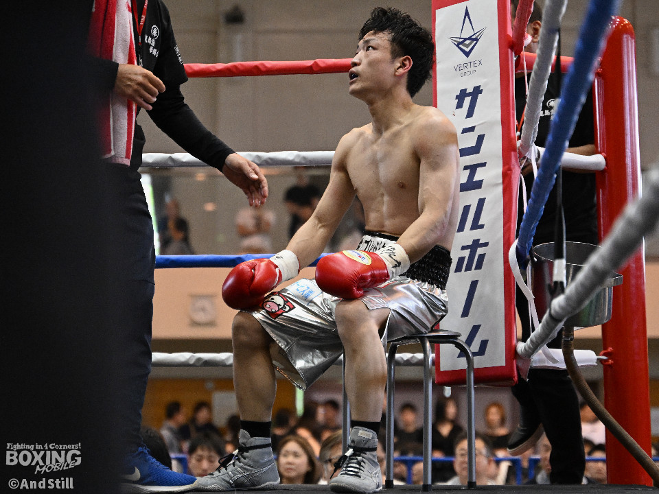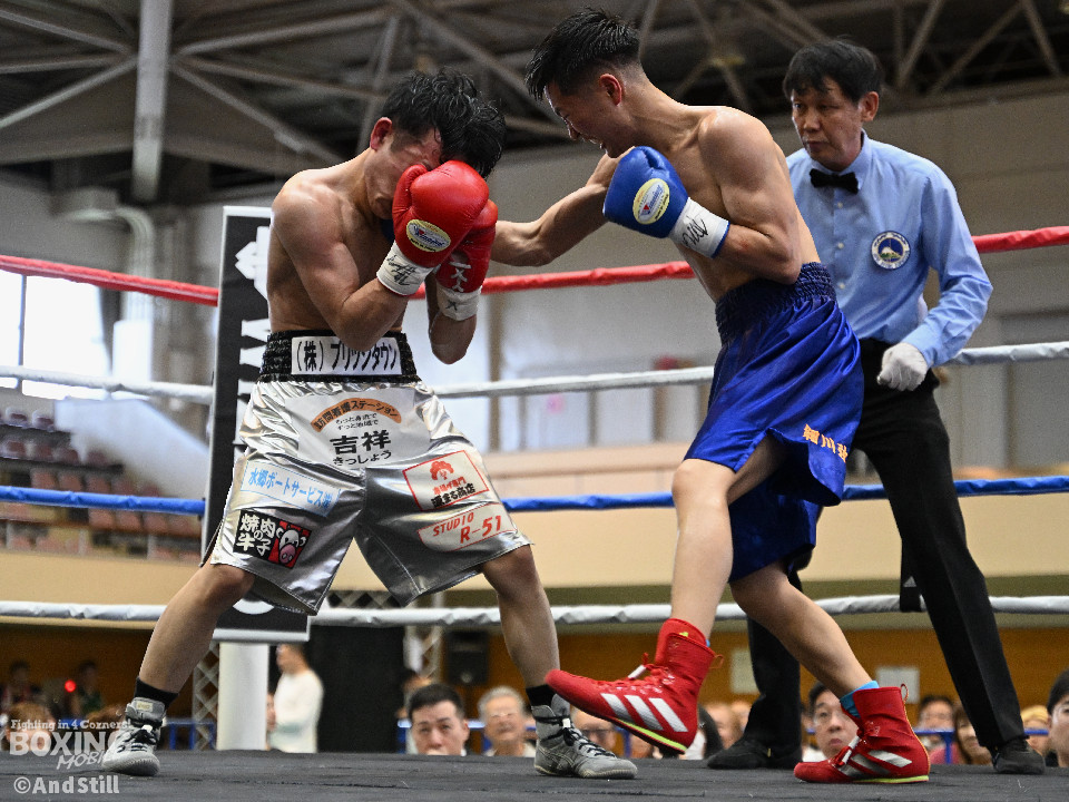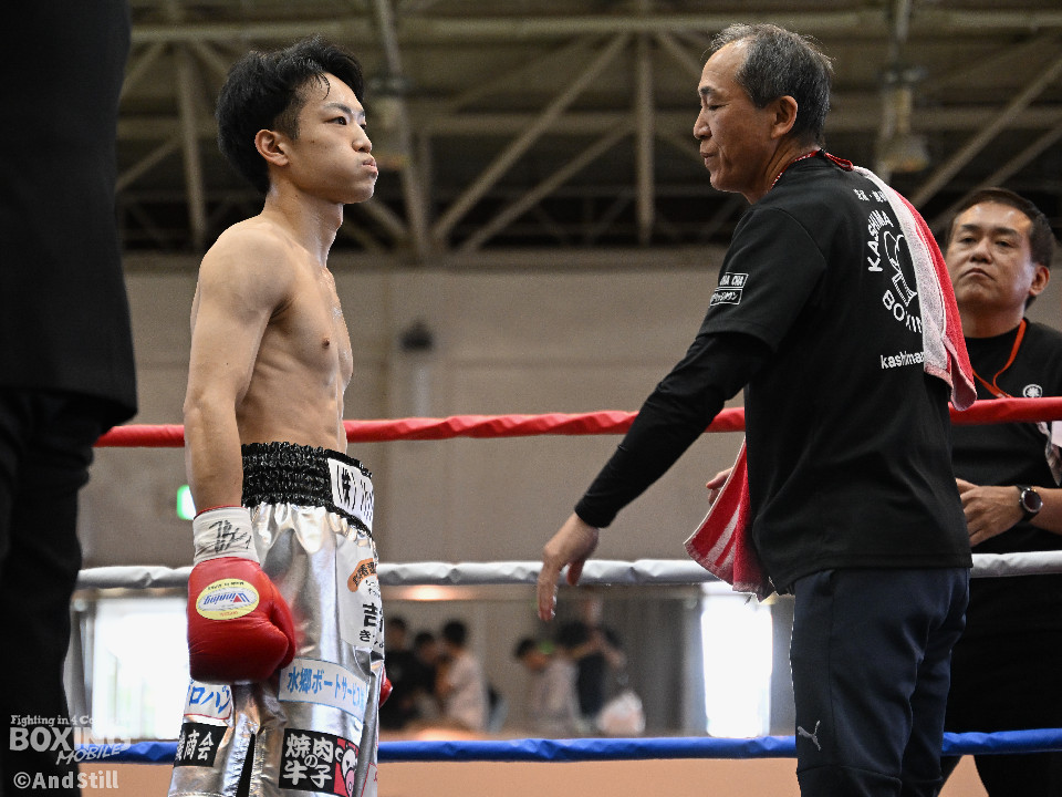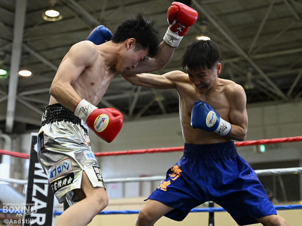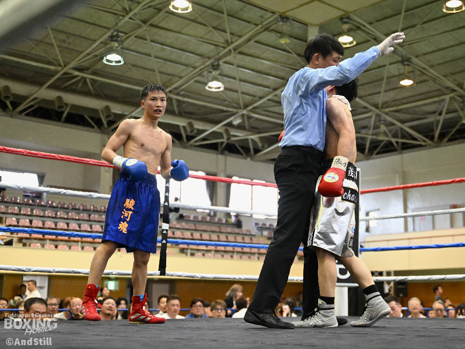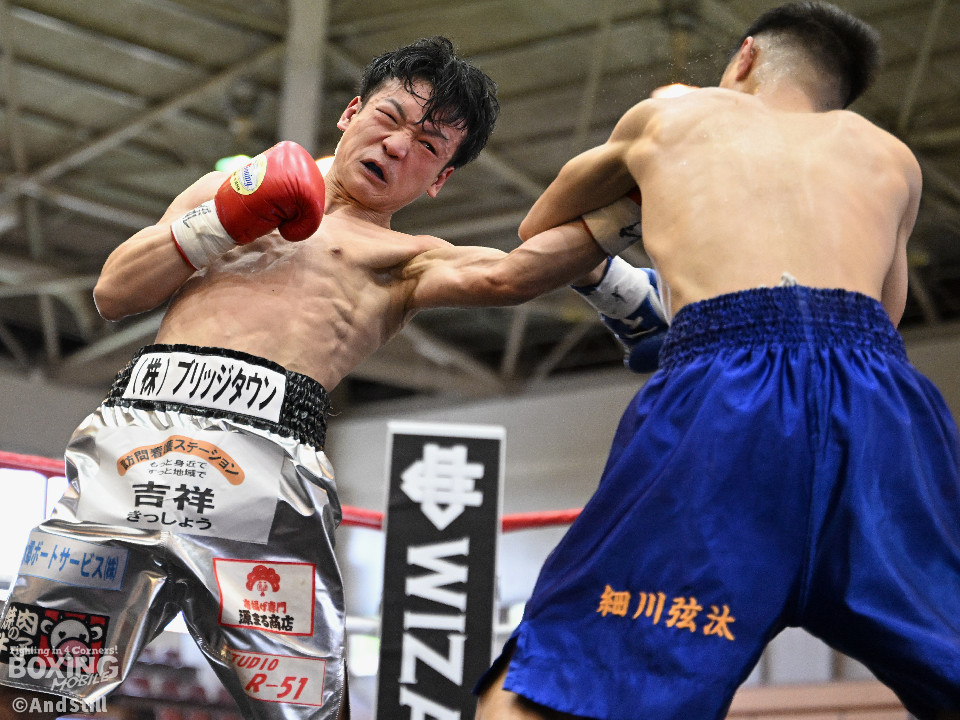 試合:細川がゴングと同時に弾けたように篠塚の元へ走り込み連打。篠塚も頭をつけて打ち合うが終盤はペースダウンする。2回も細川が連打とプレスの蟻地獄に引き込む。ボディを狙われた篠塚はペースが落ちロープを背負う展開が増える。3回、篠塚が打ち合いの提案に乗ると左右フックをカウンターで打ち抜く。4回序盤、お互いノーガードの打ち合いで会場を沸かせる。ここでも篠塚が先にペースダウン。5回、開始同時に細川が一気に攻めたところで篠塚の動きが止まり、レフェリーが試合を止めた。試合後、細川は「僕はただのチャンピオンではなくスーパーチャンピオンになります!」と高らかに宣言した。