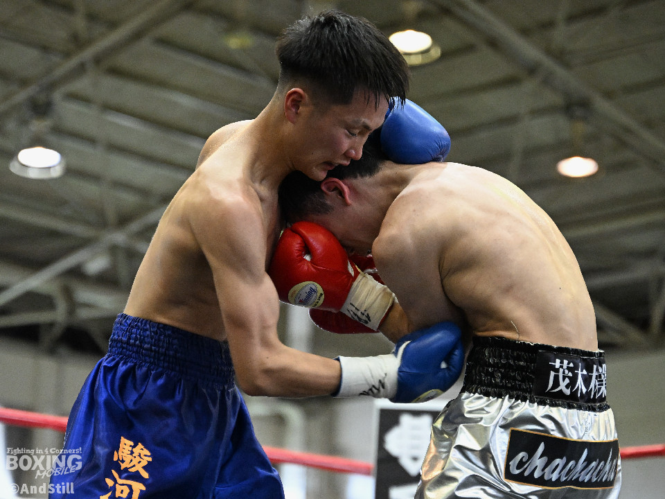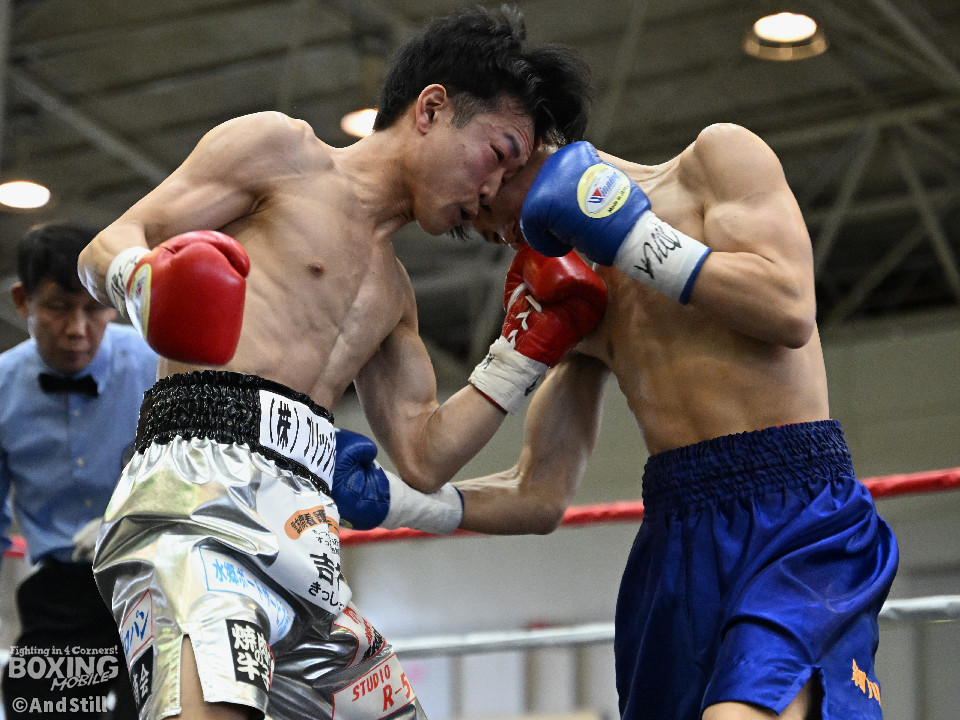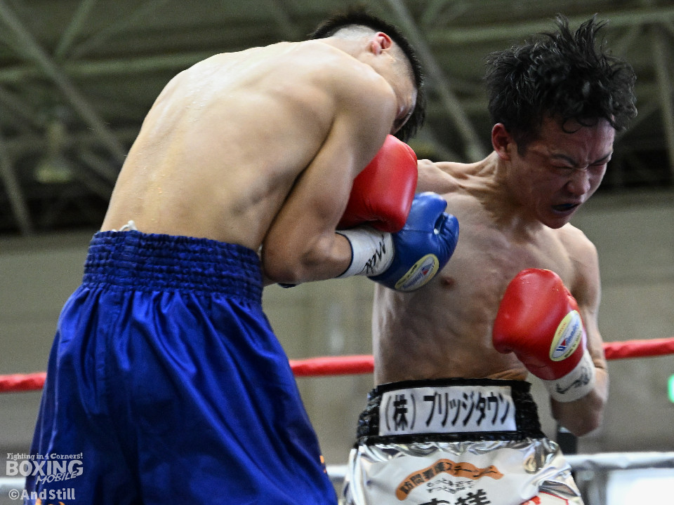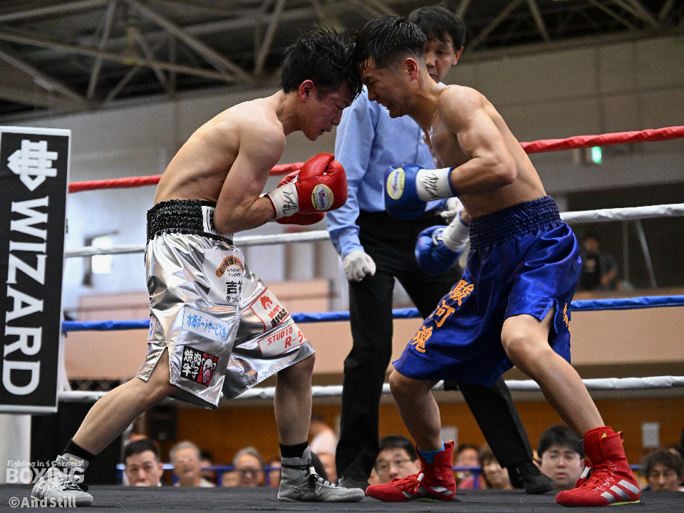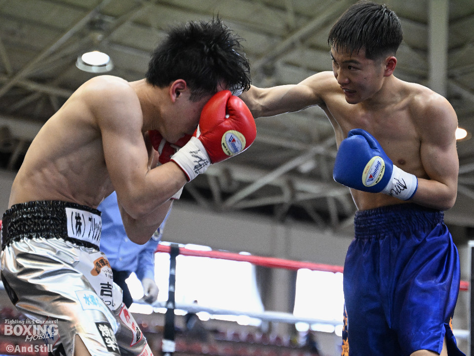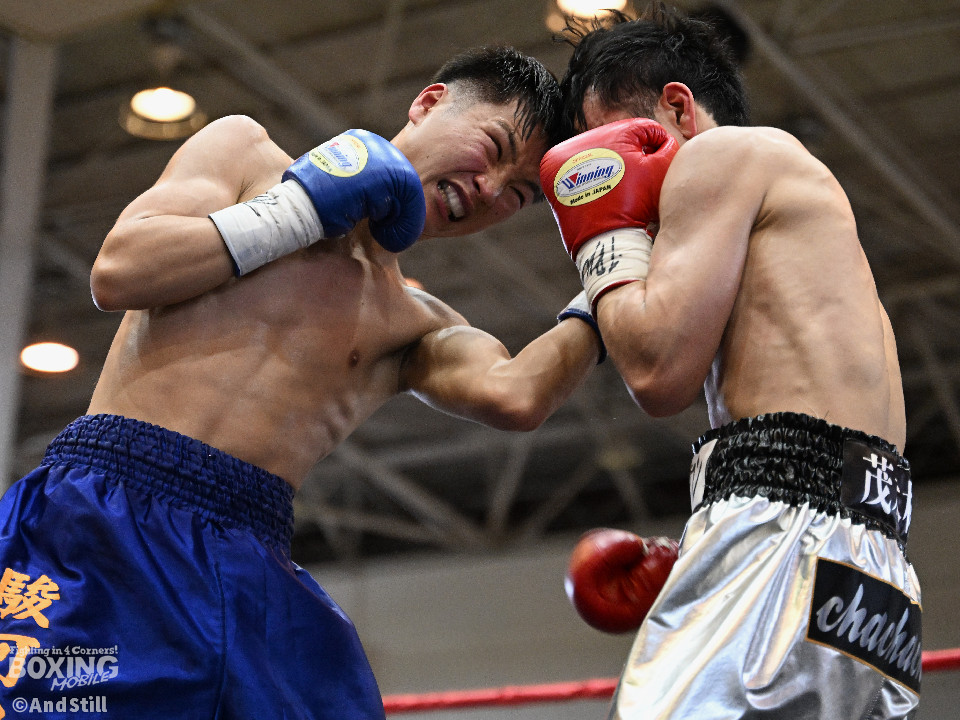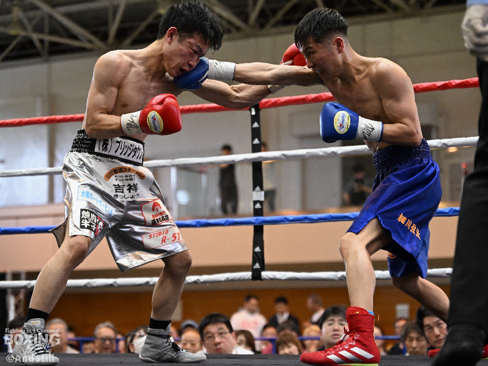 試合:細川がゴングと同時に弾けたように篠塚の元へ走り込み連打。篠塚も頭をつけて打ち合うが終盤はペースダウンする。2回も細川が連打とプレスの蟻地獄に引き込む。ボディを狙われた篠塚はペースが落ちロープを背負う展開が増える。3回、篠塚が打ち合いの提案に乗ると左右フックをカウンターで打ち抜く。4回序盤、お互いノーガードの打ち合いで会場を沸かせる。ここでも篠塚が先にペースダウン。5回、開始同時に細川が一気に攻めたところで篠塚の動きが止まり、レフェリーが試合を止めた。試合後、細川は「僕はただのチャンピオンではなくスーパーチャンピオンになります!」と高らかに宣言した。