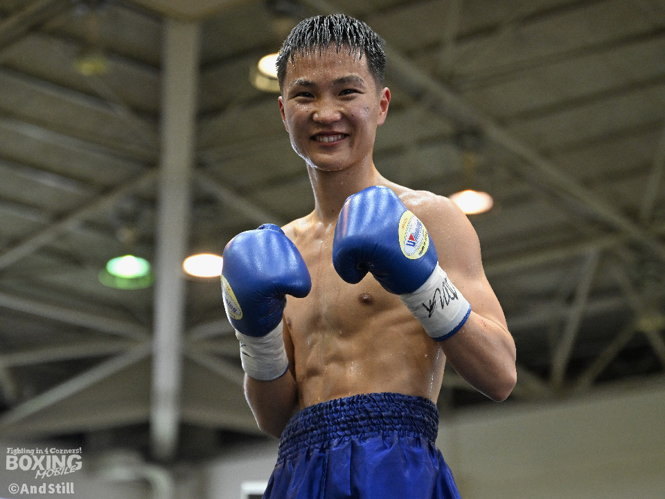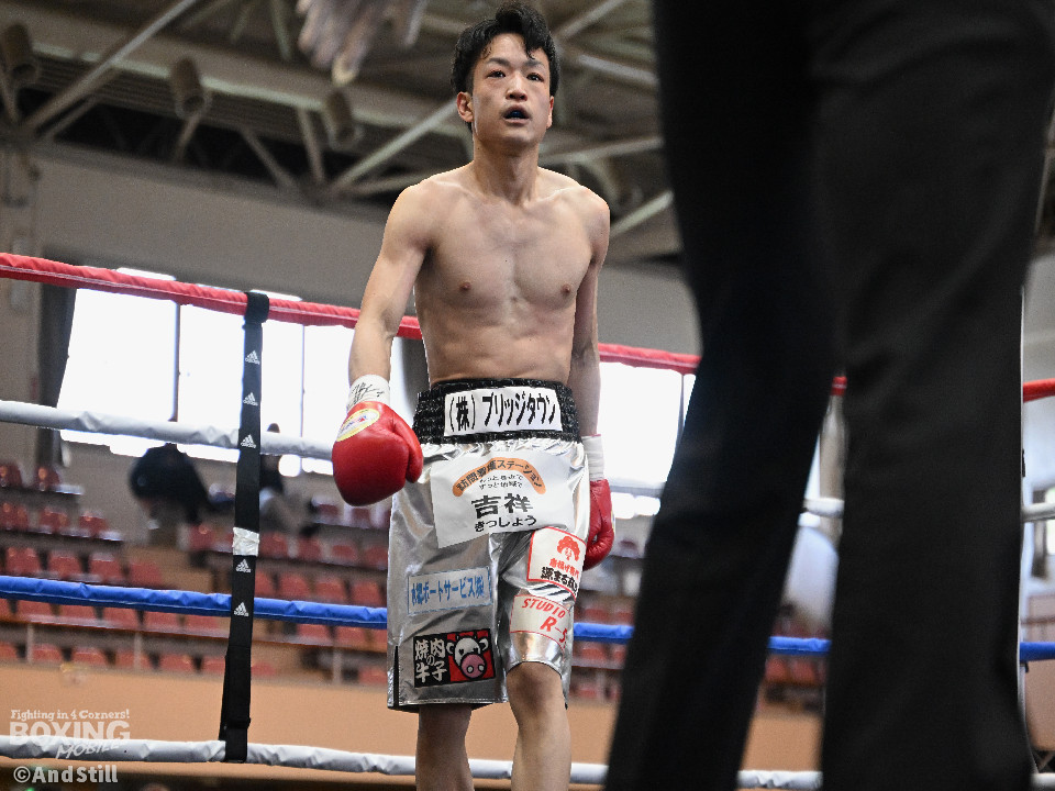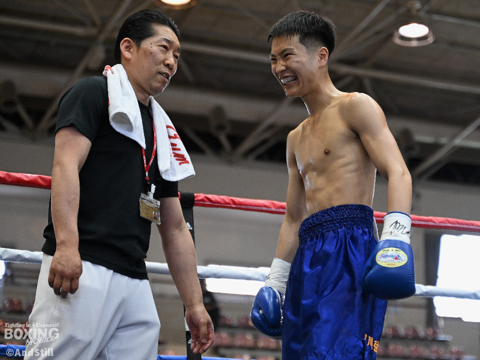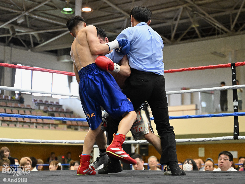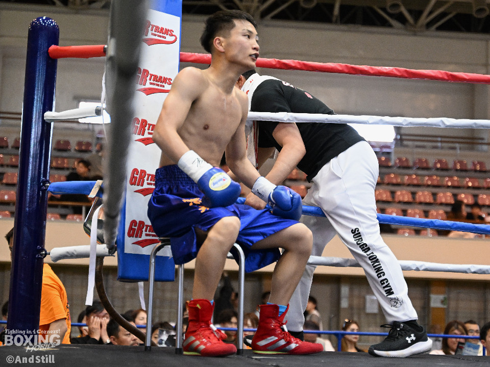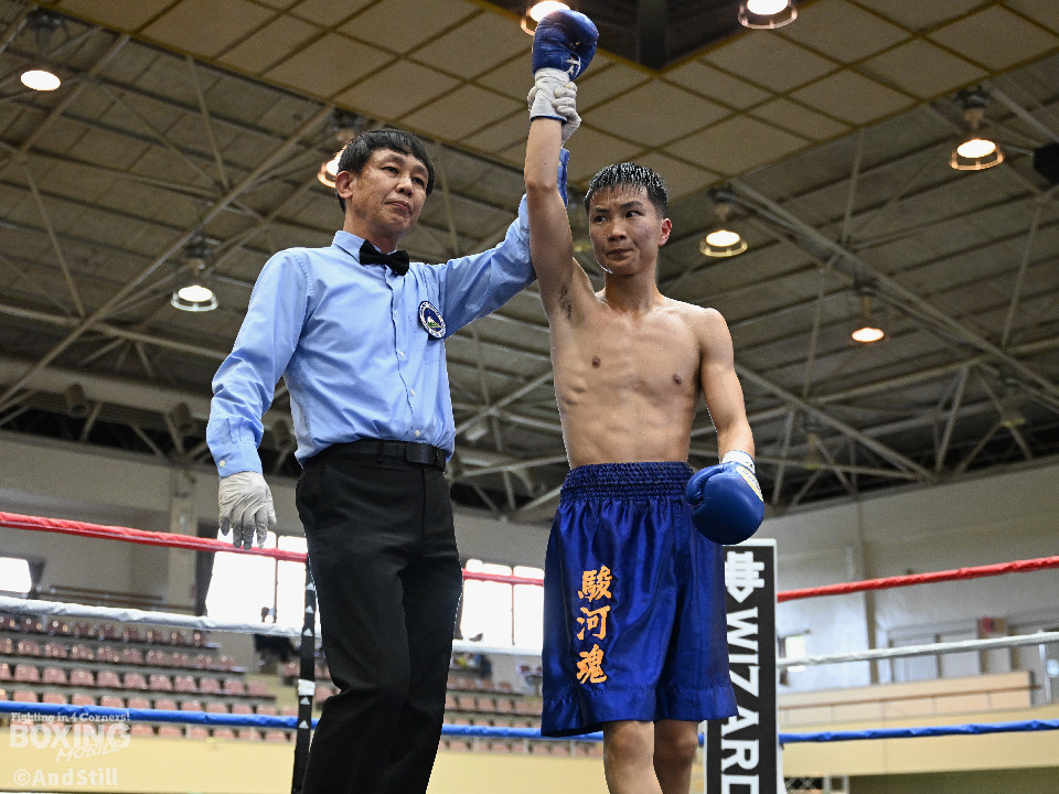 試合:細川がゴングと同時に弾けたように篠塚の元へ走り込み連打。篠塚も頭をつけて打ち合うが終盤はペースダウンする。2回も細川が連打とプレスの蟻地獄に引き込む。ボディを狙われた篠塚はペースが落ちロープを背負う展開が増える。3回、篠塚が打ち合いの提案に乗ると左右フックをカウンターで打ち抜く。4回序盤、お互いノーガードの打ち合いで会場を沸かせる。ここでも篠塚が先にペースダウン。5回、開始同時に細川が一気に攻めたところで篠塚の動きが止まり、レフェリーが試合を止めた。試合後、細川は「僕はただのチャンピオンではなくスーパーチャンピオンになります!」と高らかに宣言した。