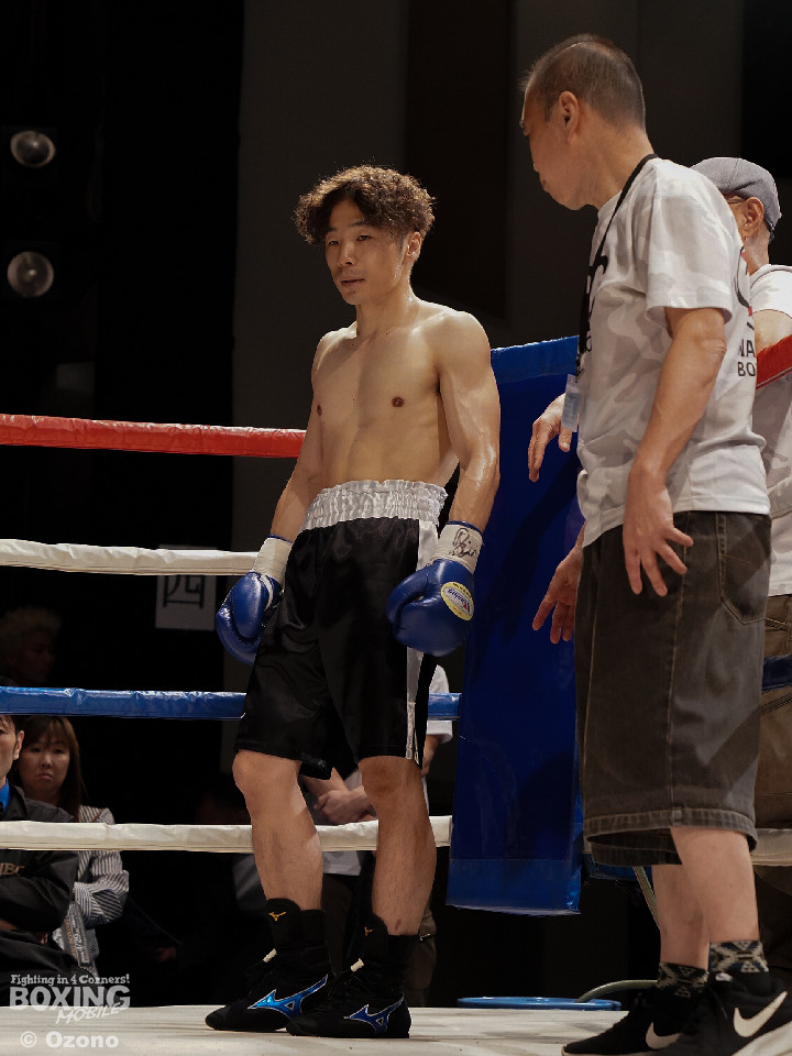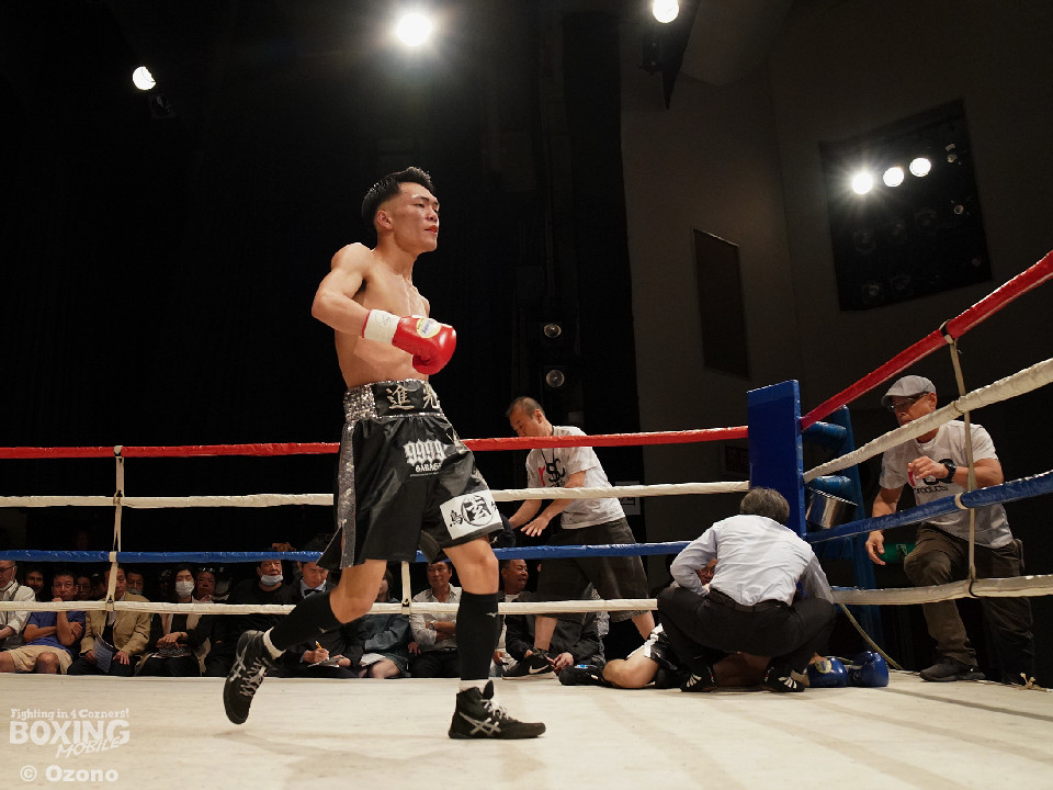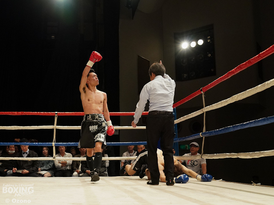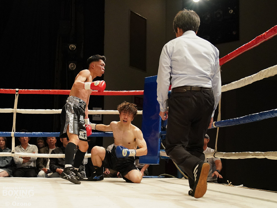 試合:勝負がついたのは初回。ワンツーでプレスをかけた宮田が左フックにつなげてリズムを作った。中園もワンツーで応戦するが、終盤にワンツーからレバーを叩いた宮田がダウンを奪うと、レフェリーがテンカウントを数え上げた。