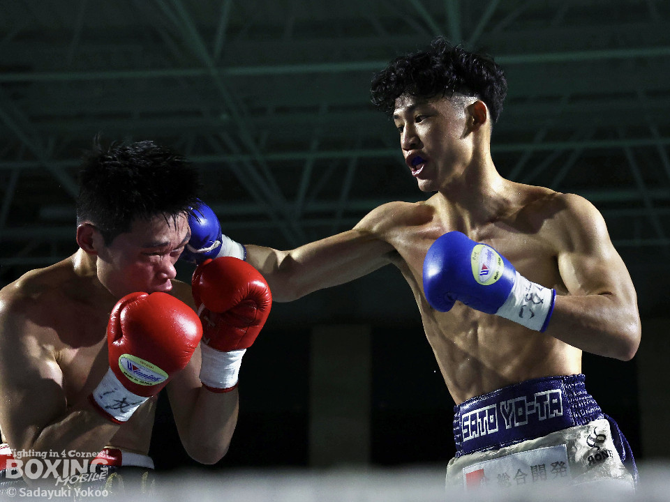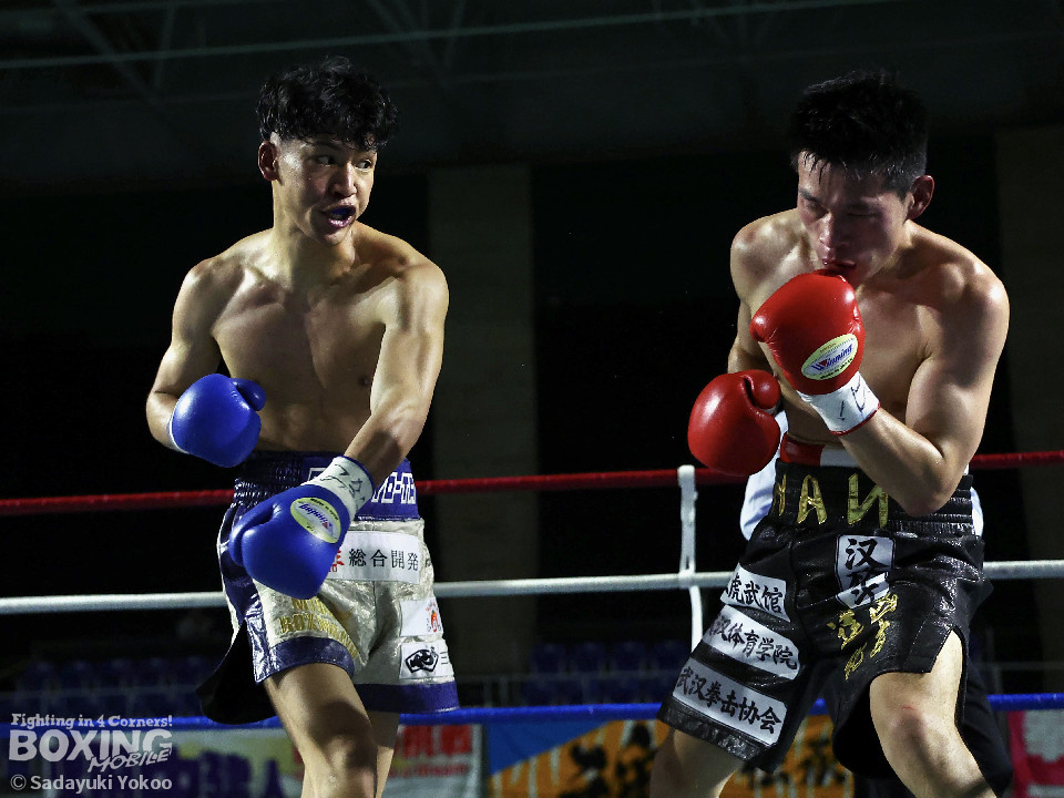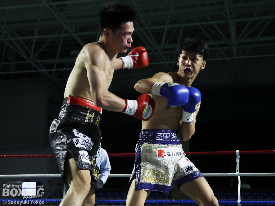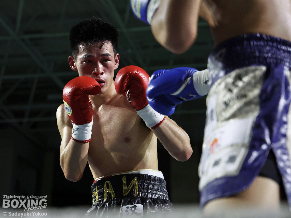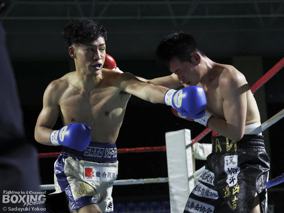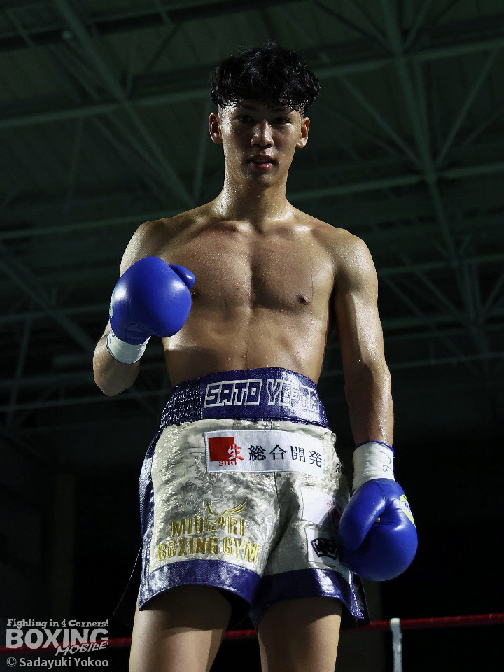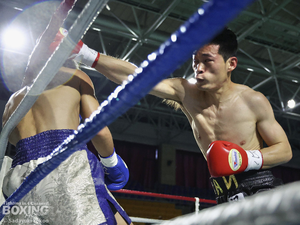 試合:サウスポー佐藤が左ストレート、左ボディアッパーを好打し主導権を支配。2回、ウは右ボディで反撃するが、佐藤は左ボディアッパーを突き刺すと右フックをヒット。3回、佐藤はボディにパンチを集めて動きを止めるとワンツーを好打。被弾したウだが、単発の右フックをねじ込み勝負を諦めず。4回、佐藤は右フックで顔を弾き攻勢。しかし、ウも最後まで粘り強く戦い試合終了のゴングを聞いた。4勝目を挙げた佐藤がB級昇格を決めた。
