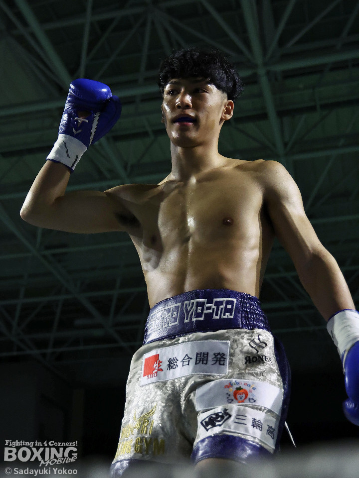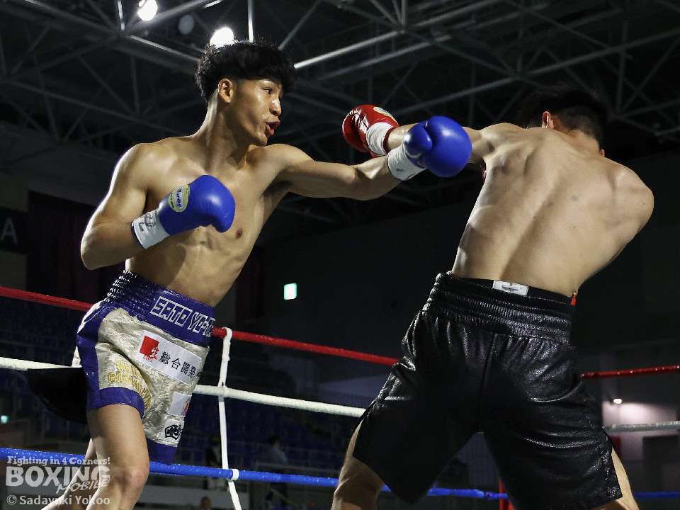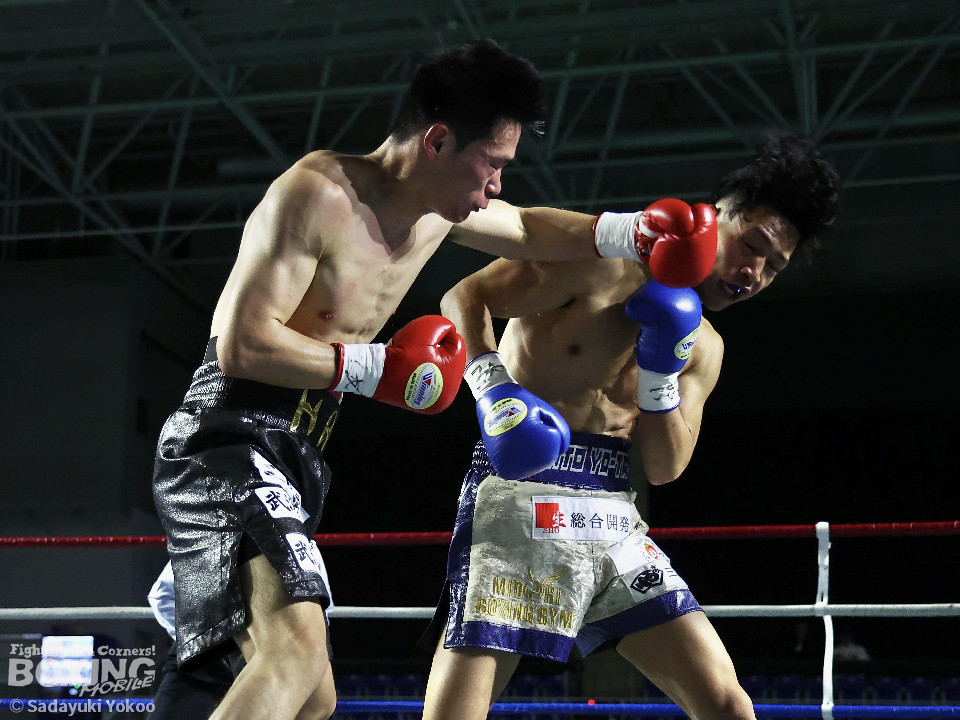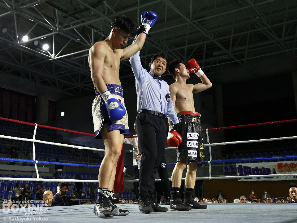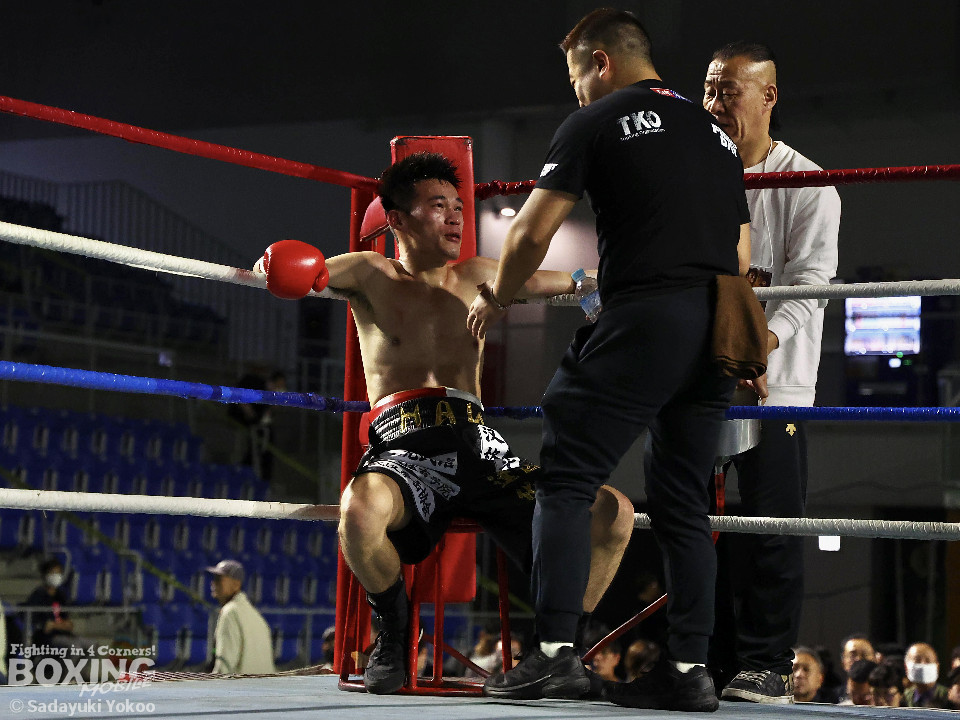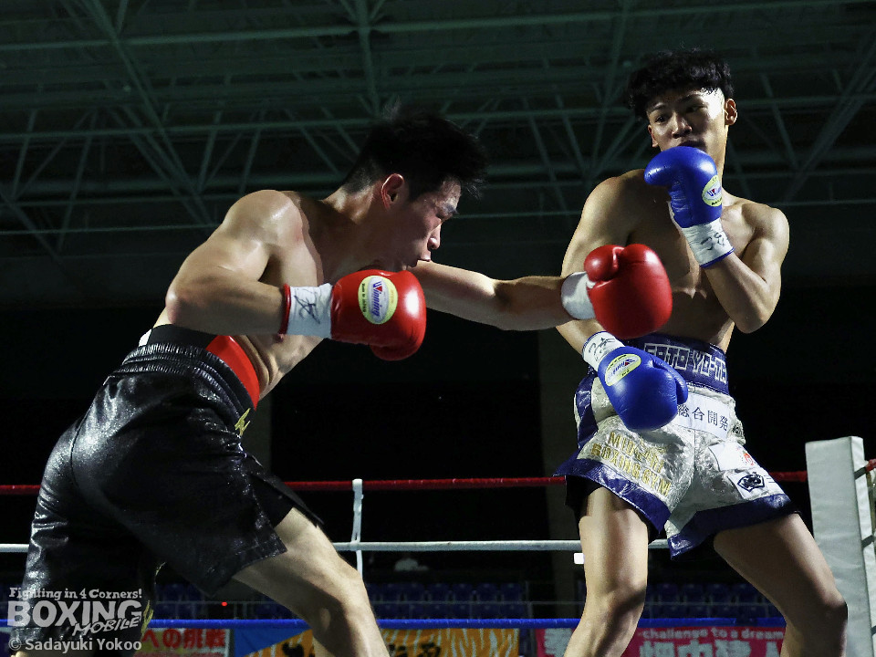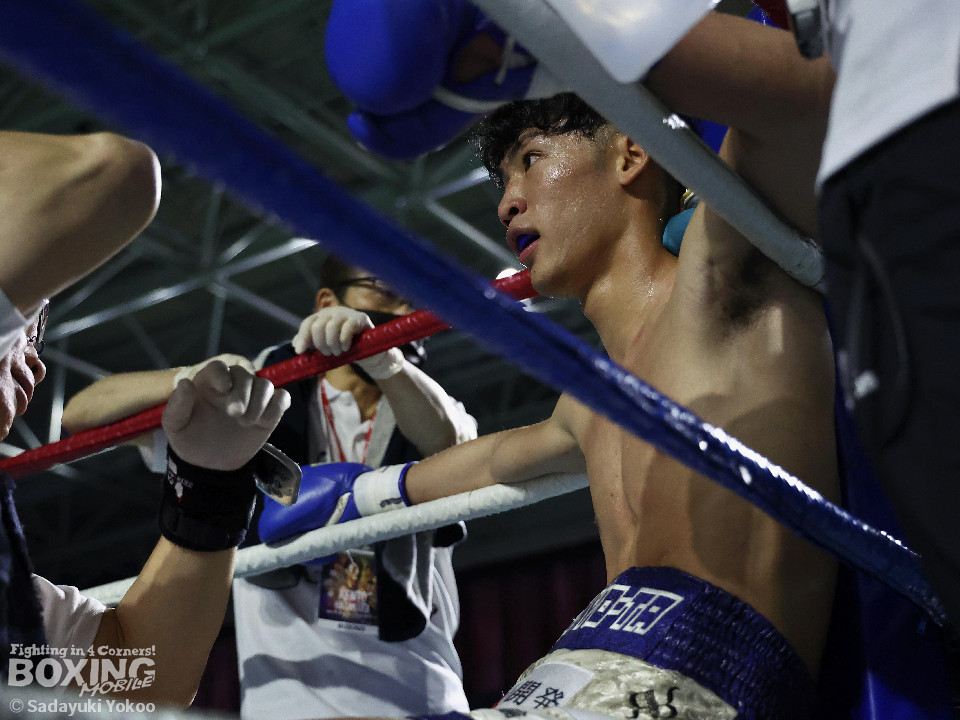 試合:サウスポー佐藤が左ストレート、左ボディアッパーを好打し主導権を支配。2回、ウは右ボディで反撃するが、佐藤は左ボディアッパーを突き刺すと右フックをヒット。3回、佐藤はボディにパンチを集めて動きを止めるとワンツーを好打。被弾したウだが、単発の右フックをねじ込み勝負を諦めず。4回、佐藤は右フックで顔を弾き攻勢。しかし、ウも最後まで粘り強く戦い試合終了のゴングを聞いた。4勝目を挙げた佐藤がB級昇格を決めた。