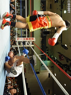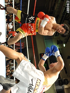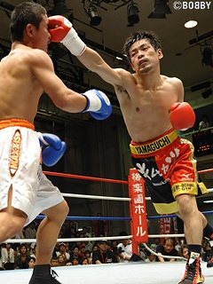 試合:昨年12月、世界王者内藤大助に挑戦して以来の復帰戦。序盤から低い体勢で左ボディを狙っていく山口。対するガオタワンもボディで応酬、そこからフックまで返しの速い攻撃をするも、山口はジャブでうまくまわしながら、入ってくるところをアッパー、ボディと攻撃のリズムをつくる。3R、山口はしっかりガードをかためながら低い位置から深めの左ボディ、足が止まったガオタワンに連打を浴びせ、2度のダウンを奪う。5R早々、大振りが目立ち始めたガオタワンに連打、右アッパーでレフェリーストップを呼び込んだ。半年振りの復帰戦を勝利で飾り、「世界を目指して一からまた頑張ります」とコメントしていた。