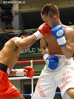 試合:サウスポー笛木に対し、身長で10cm以上小さいオーソドックスのマガレはガードを固め、身体を振りながらインファイトに持ち込み右ストレート・左フックを笛木にヒット。早くも主導権を掴む。笛木は距離を保ち、ミドルレンジから左ストレート・右フックを狙いたいが、マガレのプレスに距離を潰され、右アッパー・左右フックを連打を浴びる。笛木は自ら下がってしまい、インファイトで右フックの連打でグラつく場面も。終始、マガレがガードを固め距離を詰め、笛木に足を使わせずインファイトの展開。6R、マガレは右アッパーでグラつく笛木にラッシュを掛け、コーナーで左右フックからの右ストレートをヒット。ここでレフェリーが笛木のダメージが深いと判断し試合を止めた。