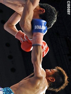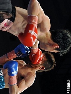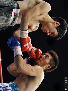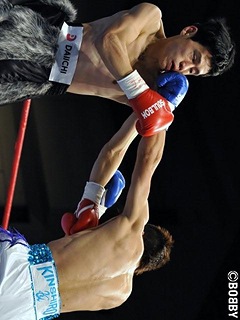 試合:臼井は、地味なイメージを払拭する激しい闘いを挑んだ。前半は、低い体勢から踏み込み良く伸びのある左右ストレートを屈し。大場のアッパーを封じる。大場は距離を詰めようと必死。3Rに入ると大場は、接近してコンパクトに左右アッパーを使い出す。4R、臼井の伸びのあるストレートが大場の顔面にヒット。圧倒する。中盤、大場が接近戦を挑み左アッパー、右ボディアッパーを決める場面も。壮絶な殴り合い、プレスの掛け合い。場内、ワッショイわっしょいと臼井側応援団が大興奮。だが6Rに入るとバッティングで臼井が右瞼をカット。ボクサー生活初のカットだ。7R、臼井が大場をロープに詰める場面が多いも、ここで臼井にドクターチェック。再開後、大場の右フックに臼井は左フックを合わせる。8R、臼井プレス強める。そんな中、大場のコンパクトな右フックが炸裂。臼井も大場の突き上げる右ストレートをかいくぐり左フックをヒット。一進一退の打撃戦。終盤戦、臼井プレスかけるも大場の打ち下ろしの右フック、左ストレートがヒットで攻勢のなか終了のゴング。果たして採点は僅差で大場の防衛。ジャッジ3者の採点が一致するラウンドが3つだけとい う、バラけた判定になった。
