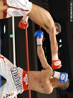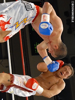 試合:淵上が距離の長いジャブで距離を計り、左ボディストレートで先制。さらに左ストレートを繰り出すとこれがクリーンヒットし早くもダウンを奪う。1Rを凌ぐ岡田山だが、淵上が一気に主導権を奪いロングレンジのジャブ・左ストレートでポイントを奪う。岡田山は得意の大降り左右フックを振り回すが淵上はこれをディフェンス。終始、淵上がジャブ・左ストレートを打ち込みダメージを蓄積。8Rに淵上のワンツーがクリーンヒットさせたところでレフェリーが堪らず試合を止めた。
