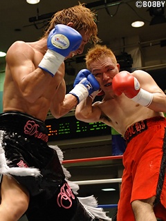 試合:開始と同時に互いにワンツー・左フックを打ち合う打撃戦。両者一歩も引く事無い打ち合いに互いが被弾し、会場は序盤からヒートアップ。中盤、松本はワンツーを軸にし、東上はワンツーから左ボディを打ち分ける。松本は手数で上回るも、東上が的確性で松本を上回る展開に。終盤に差し掛かっても両者の手数は落ちず、ワンツー・左フックを打ち合う我慢比べの展開に。最終8R、休む事無く打ち合う熱戦は判定となった。