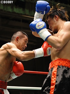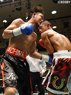 試合:身長で上回る阿知和がプレスを掛けるが、大嶽は右アッパー・左フックをコンパクトに打ち込み阿知和のプレスに応戦。序盤は、阿知和の接近戦に大嶽が左フック・右アッパーを的確にヒットさせポイントを奪う。しかし、阿知和のプレスが徐々に功を奏し、大嶽をコーナー・ロープに詰める。中盤以降、阿知和が大嶽をロープに詰め、互いに左右ボディ・左フック・ワンツーを打ち合う展開。両者互角の手数だが、コーナー・ロープを背負ってしまう大嶽は印象が悪い。最終8R、両者一歩も引かない打撃戦でポイントを奪おうとするも試合は判定に。序盤は大嶽がポイントを奪ったが、中盤以降、阿知和がプレスを掛け続けポイントを挽回し、三者三様ドローとなった。