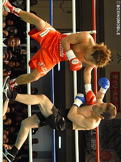 試合:設楽が小野木をロープに詰め、左右フックでダウンを奪いTKO勝利。