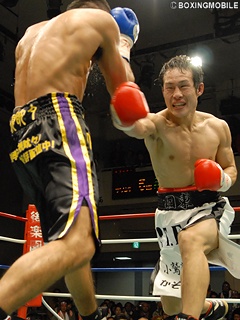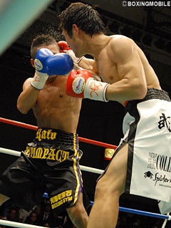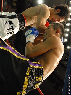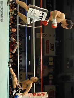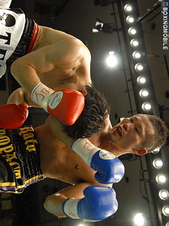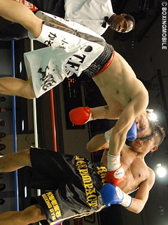 試合:王者・近藤明広、指名挑戦者・加藤との初防衛戦。スタートと同時に主導権を奪おうとパンチを繰り出す両者。オープニングヒットは近藤が右ストレートで先制するが、加藤もすかさず右ストレートを打ち返し近藤の膝を一瞬落とす。加藤はジリジリとプレス。右ストレートをヒットさせるが、近藤は足を使い連打を許さず、ジャブでサイドに動き右ストレートを返す。3Rに入り、ジャブの刺し合いから互いに左フックを打ち合う。が、一瞬早く近藤のフックが加藤を捕らえ、加藤は痛恨のダウン!しかし加藤のダメージは浅くラッシュを掛ける近藤を迎え打ち、互いに接近戦から左フック・左ボディをヒットさせるも、近藤の右ショートアッパーが加藤の顎を跳ね上げる。ダウンポイントを奪った近藤は、4Rに入っても必要以上にKOを狙う事無く、ジャブで冷静に試合を組み立て右ストレートに繋ぐが、加藤もプレスを掛け右ストレートをヒット。以降、プレスの加藤に近藤はジャブで距離を保つも、距離が近く右ストレートの打ち合いに。互いに右ストレート、左ボディと意地の張り合いになり、会場もヒートアップ。試合は判定となり、一者が加藤、二者が近藤を支持。ダウンポイントが明暗を分け、近藤が日本王座初防衛に成功した。