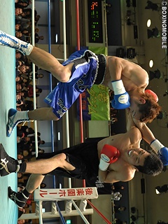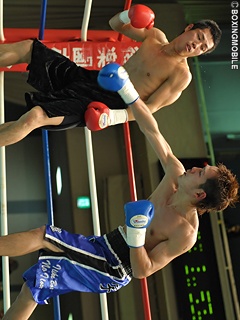 試合:立ち上がり、低い構えからどんどんフェイントを入れ、外に大きく回る三谷に対し、速いジャブで追う阿部。距離を縮めたら回転よくショートで打ち込む阿部だが、反応のよい三谷がかわしていく。2R、三谷がフェイントで誘い、打たせてもぐりこんでボディ、アッパー、右ストレートとバランスよい重心でヒット。3Rに入ると阿部が外を回り、三谷が追う形に。5R、スイッチで攻撃パターンを変える阿部に距離を詰めて打って出る三谷だったが、偶然のバッティングにより阿部の前頭部が流血。負傷判定の引き分けとなった。