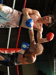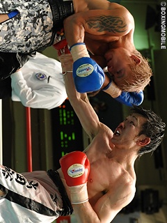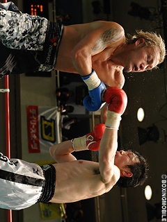 試合:フェイントを入れながら、相手の出方を探るような静かな立ち上がりの両者。先に動いたのは、ボディで飛び込んだり、ジャブで詰めて接近戦をのぞむ出田。低い体勢から突き上げるようにジャブを出す沼田に対し、左ボディ、上下に散らしてジャブ、ストレートと細かい手数で攻めていく。中盤から徐々に沼田のプレスが強くなり、6R、離れ際に左フック、右ストレートがヒット。たまらず出田の顔がゆがむ。7R、さらにプレスをかける沼田が、相手のジャブをかわしてストレート、一発目二発目を捨ててフックと放ち、出田が後ろに下がるシーンが多くなる。8R、くっついて細かく手を出す出田だが、ショートカウンターで打たれだし、疲れのあとが見える。そこへ一気に仕留めにかかるかのような沼田の左右ボディから左フック、相手のパンチを外して豪快な連打。出田が打ち合いに出るも離れ際に再度左フックを受け、流れるようにリングに倒れこんだところでレフェリーがノーカウントで割って入る。沼田の豪快なパンチが炸裂、復活の狼煙をあげた一戦となった。