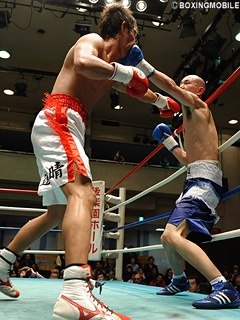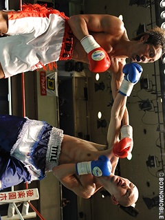 試合:フェザー級の荒井と、日本スーパーライト級3位の方波見。さらには初8回戦、初ランカー挑戦の荒井が、独特のサウスポースタイルで変則的なボクシングをする方波見に挑む。立ち上がりから果敢に懐の深いボディを攻めていく荒井。対する方波見は右で相手をいなしてストレート、大きく左右アッパーを見せてくる。相手の動きをよく見て、二発三発、体を入れ替えて四発としつこく追う荒井。中盤以降、次第に右ストレートがヒットしはじめる。方波見は体をうしろにねじりながらアッパー、飛び込みながら左ボディで独特のテンポで仕掛ける。5R、左右ボディ、右アッパー、ストレートとヒットさせる方波見。続いて6R。開始早々、前へ出る方波見に荒井の右が炸裂。方波見、痛恨のダウン。最終Rには落ち着きを取り戻し、しっかり右足を軸にボディフック、アッパーと放つ方波見だったが、荒井のストレートでのけぞるシーンも多くなり、判定負けを喫した。