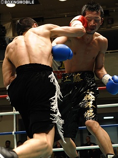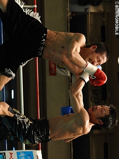 試合:序盤から高さやスピードを変えて左を出す工藤。頭を振りながらワンツースリーまでテンポよくつなげていく。対する大竹はガードの上を打たせながら、ジャブでまっすぐ追ってプレスをかける。どのラウンドも前半は工藤がワンツー、入りばなをアッパー、ノーモーションの右ストレートなど、打っては離れ打っては離れる展開。一方、大竹は執拗にジャブ連打で真っ直ぐ追い、もぐりこんでカウンター。各ラウンド後半で相手をつかまえてショート連打でヤマ場を作る。6R、スピード上げて出てくる大竹。打っては動く相手の行く先を封じて右ストレート、工藤ダウン。7R、速いジャブでプレスをかけながら、工藤の打ち終わりを狙って左フック、右クロスを放つ大竹。ノーモーションの右ストレート、フックで対抗する工藤だが、8R、接近戦で大竹の右が炸裂しはじめたところ、レフェリーが割って入った。