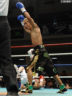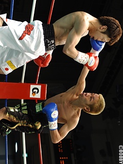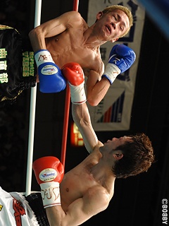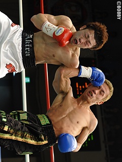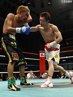 試合:王者・八重樫のV2戦。素早いジャブの応酬で試合はスタート。身長と距離で上回る武市がフリッカー気味の角度を変えるジャブで八重樫を捉えると、打ち下ろしの右ストレートをヒットさせ主導権を引き寄せる。武市は巧みに距離を計り、飛び込みながらの左フックで八重樫からダウンを先制。八重樫は早くもポイントを追い駆ける展開になる。武市はジャブでリズムを構築し、多様な角度のジャブで八重樫の左目を腫れ上がらせる。八重樫はプレスを掛けワンツーで距離を縮めたい。が、武市は時にはスウィッチしたり、ジャブで出鼻を挫き序盤をリード。変則ジャブに反応出来ずにいた八重樫だが、中盤に入ると武市の動きを見切りディフェンス。ワンツーで距離を詰め、左フックをヒットさせポイントを挽回する。主導権を引き寄せた八重樫は、プレスで逆に武市を下がらせる。武市は飛び込みながらの右アッパーで撹乱するが、八重樫は左ボディ・右ストレートで武市の膝を落とす。終盤、互いにワンツーをクリーンヒットさせるも、最終10Rに八重樫が王者の意地からワンツーを打ち込みポイントアウト。1Rのダウンと序盤に奪われたポイントを八重樫が中盤からワンツーで追い上げ、判定3-0で2度目の王座防衛に成功した。