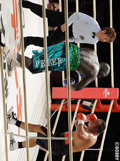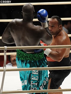 試合:頭ひとつ分の身長差がある二人の対決。先に仕掛けたのはローレンス。長身ピーターの中に潜り込んで、左ボディから続けてコンパクトな左フックで試合のリズムを作れば、ピーターも大振り気味の左アッパーで威嚇する。序盤は足を使うローレンスの左ボディと右ストレートがヒットするが、5R疲れの見えたローレンスを左右のフックで反撃に出るピーター。6R、ピーターが怒濤の右ストレートラッシュで一気に勝負を決めた。