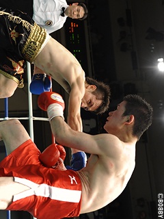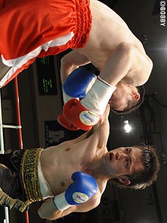 試合:サウスポー小泉がプレスを掛ければ長井もこれに応戦。長井は小泉の攻撃にベルトラインより低く頭を下げ、2Rにはローダッキングで減点1。ともに積極的に仕掛けるが3R、長井の右ストレートが的確に小泉を捉えだす。しかし4R、偶バツで小泉の右目上が切れるアクシデント。この傷が深く、ドクターチェックが入り負傷判定となった。