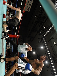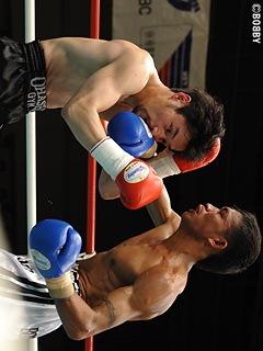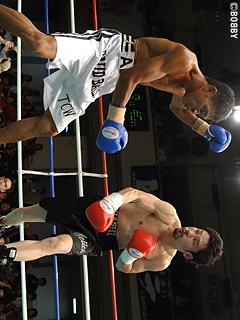 試合:岡田の復帰戦。開始早々、岡田が左ボディをクリーンヒットさせると、早くもガードを固め下がるアビ。ここでアビをコーナーに詰め左ボディ・左フックを返し主導権を掴む岡田。2Rもジャブで入る岡田だが、アビはやや大降りながらワンツーから左フックを繰り出すと、これがクリーンヒットし岡田は痛恨のダウン。岡田はコーナーに押し込こまれ、連打されるがゴングに救われる。3R、アビが勝負に出る。ダメージの残る岡田もこれに応戦し、左ボディから右ストレートを返し、逆にロープに詰め、再び左ボディをヒットさせると悶絶するアビ。レフェリーはカウントを数える事無く試合を止めた。