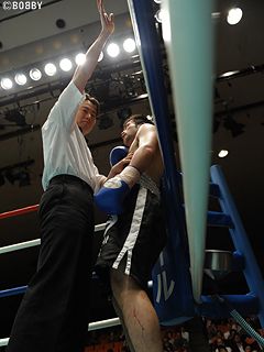 試合:サウスポー横山の左ストレートで早くも原之園は右目上をカット。リズムを掴んだ横山は左ストレートを的確にヒットさせる。2R、横山の左ストレートで膝が落ち、コーナーに詰められる原之園。原之園はワンツー連打を打ち込まれるとガードを固め下を向いてしまい、レフェリーが堪らず試合をストップ。