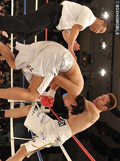 試合:次期日本スーパーウェルター級挑戦者決定戦。西がゴングと同時に右ストレートを振り抜くも、湯場は冷静にディフェンス。左ストレートを上下に打ち分け、早くも主導権を掴む。2R、距離を把握した湯場は左ストレートをヒット。西はプレスから距離を詰めようとするが、湯場が下がりながらの左ストレートをカウンターで打ち込み、西は両手を付くようにダウン。カウント8で立ち上がるも、湯場が狙い済ましたワンツー3連打を打ち抜くと西は崩れるようにダウン。湯場が次期挑戦権を奪い取った。