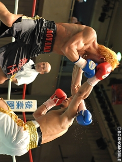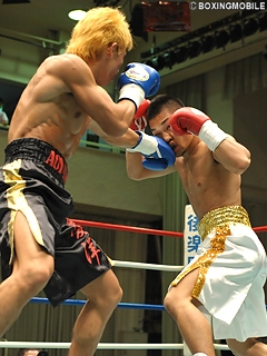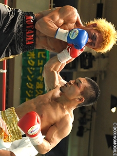 試合:ジャブで中村の前進を止めたい青山に、中村は飛び込みながらの左フック・右ストレートをヒット。青山も下がることなくジャブ・右ストレートで反撃。2R、両者とも偶バツで左目上をカット。中村はプレスを掛け距離を詰めるが、頭らから入ってしまう場面が多く、4Rにはバッティングで減点1。後半、プレスを掛け続ける中村は、左フック・右ストレートを青山にヒットさせ距離を掴む。しかし7R、中村の左目上の傷が悪化。ドクターストップとなり試合は負傷判定に。4Rに減点1を奪われるも、中村が判定2-1で青山を振り切った。