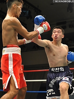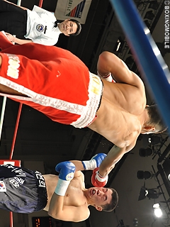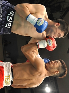 試合:身長・リーチで上回る外園は、ロングレンジのジャブ・ワンツーで距離を保つ。朴は左右フックでプレスを掛けるが、外園のジャブに距離を詰められない。中盤、距離とリズムを掴んだ外園は、右ストレート・左フックで朴の膝を落とす。4R、外園は右ストレートに後退する朴をロープに詰め、ワンツー・左フックの連打を打ち込みレフェリーストップを呼び込んだ。