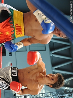 試合:ジャブで距離を計る福原に対し、タナダは左フックで応戦。立ち上がりから両者の右ストレートがヒットする。2R、積極的に仕掛ける両者だが、福原の左ボディにタナダが顔を歪める。ここでタナダは強引に距離を詰め、左フック・右ストレートを返し逆に福原を下がらせる。3R、ジャブで距離を取りたい福原だが、ジャブの打ち終わりのガードが下がったところに右クロスを打ち込まれ崩れるようにダウン。カウント8で立ち上がるもダメージは深く、詰めるタナダのワンツー・左フックに福原は再びダウンを喫する。何とか立ち上がりクリンチに逃れたい福原。しかし、タナダの右ストレート・ワンツーに棒立ちの状態になり、レフリーが割って入り試合を止めた。