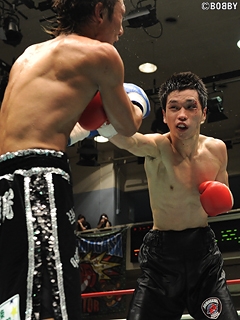 試合:東上がゴングと同時に右ボディストレートで仕掛け、これに天笠も左ボディ・ワンツーを返しペースの取り合い。2R、左右ボディから右クロスをヒットさせる東上に、天笠も左右ボディ・左フックで東上を下がらせ、追撃の左右フック・右ストレートでダウンを先制。カウント8で立ち上がる東上。その後も天笠はリーチを活かし、ロングレンジのワンツー・左ボディで攻め込む。中盤、東上が距離を潰すべく思い切り踏み込んでのワンツー・左フックで反撃に。天笠も下がることなく左右ボディ・ワンツー連打と手数・クリーンヒットで東上を圧倒。終盤、天笠に右ストレート・左フック・ワンツー連打を打ち込まれる東上。だが、決して下がることなく、単発ながらも右ストレート・左フックを返し2度目のダウンを許さない。最終8R、天笠がダウンを奪うべく東上をワンツー連打でロープに釘付けとする。東上もワンツーを返し打撃戦に持ち込むが試合は判定に。ダウンを奪い、ワンツー・左ボディとクリーンヒットで上回った天笠が粘る東上を下し、再起戦を飾った。