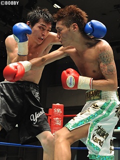 試合:リーチを活かし、丸山がジャブ・ワンツーをヒット。うすいは丸山の右ストレートの打ち終わりに合わせ左フックを狙う。丸山は巧みに右ストレート・右アッパーと打ち分け、序盤の主導権を引き寄せる。中盤、うすいは上体を振って丸山に的を絞らせず、ジャブをヒットさせ右ストレートで反撃に。6R、互いがワンツーを打ち合い踏み込むと頭が当たってしまう。この偶バツでうすいは右目上をカット。終盤、うすいがジャブ・右ストレートで丸山の顔を跳ね上げるも、丸山が右ストレート・左フックとクリーンヒットで上回り、うすいの追撃を退けた。