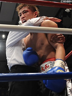 試合:距離で上回る佐藤は、立ち上がりからジャブ・右ストレートをヒット。福本は距離を詰めたいが、ミドルレンジでジャブ・右ストレートを、接近戦ではコンパクトな右アッパーを当てられ、序盤から主導権を奪われる。しかし4R、挑戦者は右ストレートで距離を詰め、左フック・左右ボディでポイントアウト。だが佐藤は流れを渡さず、5Rに距離を活かしジャブ・ワンツーから左ボディを上下に打ち分けポイント取り返すと、7Rには右のダブルで一瞬グラつく福本にワンツー連打・左フックでラッシュ。挑戦者も気迫溢れる表情でワンツーを打ち返すが、佐藤の左フック・右ストレートが顔面を捉えると、フラつきながらコーナーにもたれてしまう。ここでレフェリーが福本を抱き寄せ試合終了。佐藤が統一後の王座初防衛に成功した。