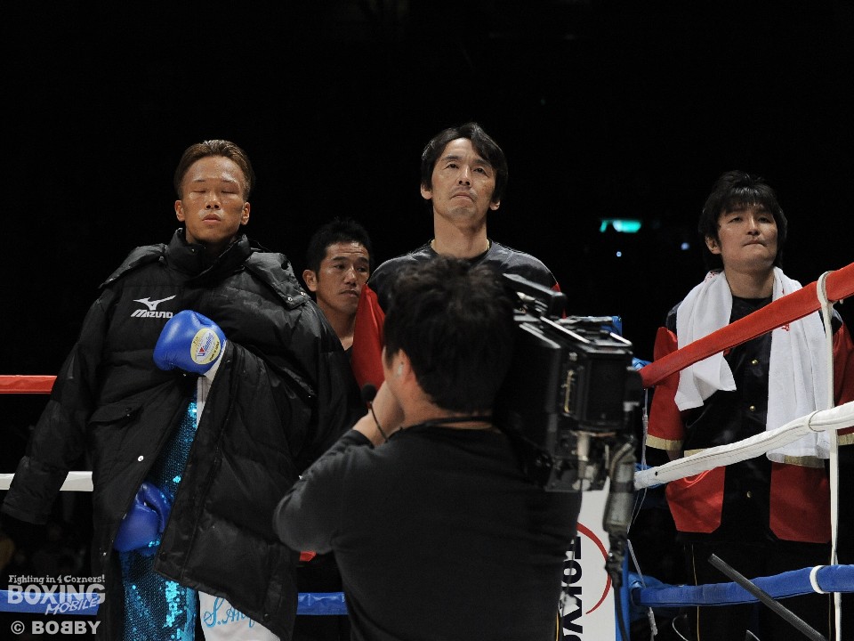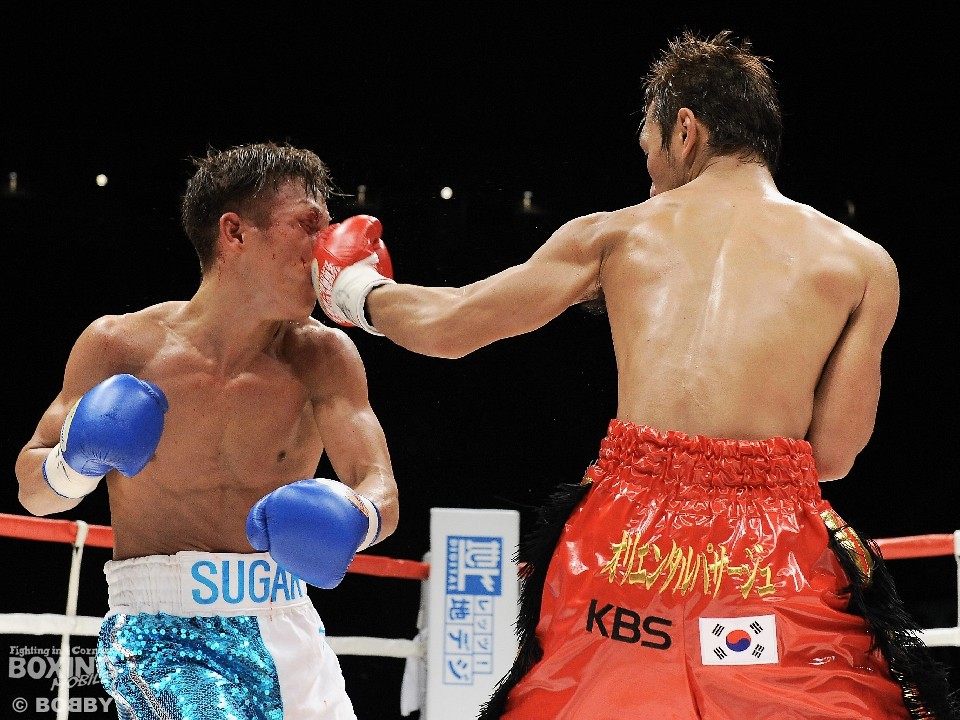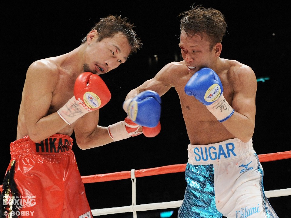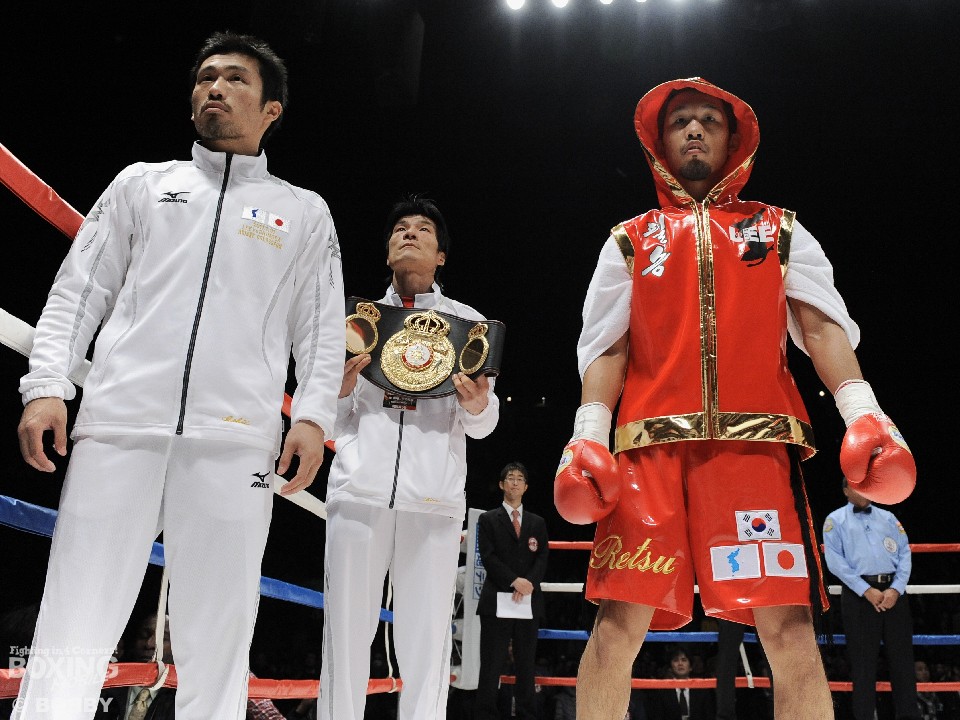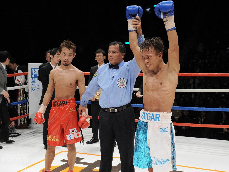 試合:開始から下田が上体を振り、ジワジワと李との距離を詰める。李も足を使い距離を保つが、互いに単発ながらストレートを打ち合い、ポジションの取り合い。しかし3R、サウスポー下田がジャブで距離を測ると、左ストレートが李のアゴを捕らえダウンを先制。立ち上がる王者に挑戦者が攻め込むが、ここでカウンター気味の右ストレートがヒット。終了間際に李がダウンを奪い返す。だが、中盤から積極的に左を上下に打ち分け攻め込む下田に、李は左右フックで迎え打つもやや大降りとなり上体が流れてしまう。5R、距離を支配した下田は、李のステップインに合わせ狙い済ましたカウンターの左ストレートを打ち抜き、2度目のダウンを奪う。立ちがる李は右ストレート・左フックの連打で反撃のチャンスを伺うが8R、下田が左ストレート・左ボディアッパーでコーナーに詰め、右フックをテンプルに打ち込むと、李はこの試合3度目のダウン。李も最後までポイントを奪い返そうと右ストレートで前に出るが、下田も集中力を切らさず左ストレート・右フックで迎撃。下田が最大で9ポイント差をつけ、李からベルトを奪い獲り、新王者に輝いた。★★★