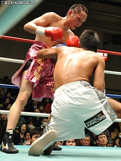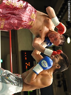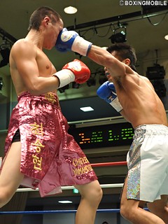 試合:序盤から積極的に仕掛ける両者は、右ストレート・左フックで主導権を奪いに出る。しかし2R、伊藤が不用意に距離を詰めると、洞平の右ストレート・左フックで膝が落ち掛ける。何とか接近戦に持ち込みたい伊藤だが、4Rに右クロスでダウンを奪われる。中盤、ダウンポイント奪い返したい伊藤は、接近戦から右フックで反撃に出るも洞平が腕を畳み、巧みに右アッパー・左フックと手数で上回る。終盤7R、洞平の右ストレートがクリーンヒットし、伊藤はガードを固めて防戦に。ここを洞平が見逃さず、ワンツー連打を打ち込みレフェリーストップを呼び込んだ。洞平は初のTKO勝利を飾った。★