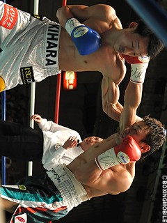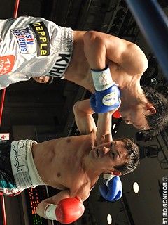 試合:挑戦者・木原のジャブ・ワンツーで試合はスタート。しかし王者・細野がガードを固めプレスを掛ける。ロングレンジからジャブ・右ストレート・左フックと繰り出す木原だが、細野はシッカリとブロックし、単発ながら強打の右クロスをヒット。4R、圧力を強める王者は左ボディから右クロスにつなぎ、挑戦者の膝を落とす。中盤、細野のプレスに、木原は右ストレートを合わせるが、前に出る細野を止めろことは出来ず、後退してしまう。終盤、圧力を掛け続ける細野の強烈な左ボディに木原はホールドを繰り返し、9Rには減点1。最後までプレスを掛け続け、左ボディ・右クロスと強打を打ち込んだ細野が、大差判定で初防衛を遂げた。★★