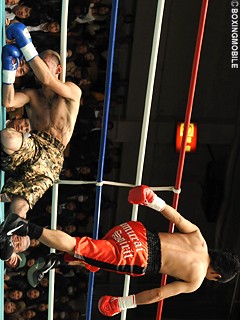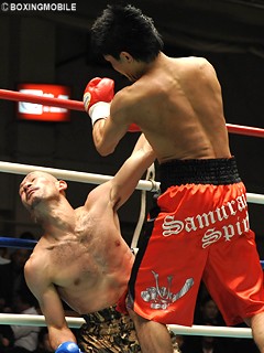 試合:伊波の右ストレートがカウンターで入り、カワシモダウン。すぐさまカワシモもワンツーで反撃するが上体が高く、ロープ際で左アッパーを浴び2度目のダウン。担架退場となった。伊波は無傷の3勝(3KO)目を上げた。★★