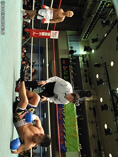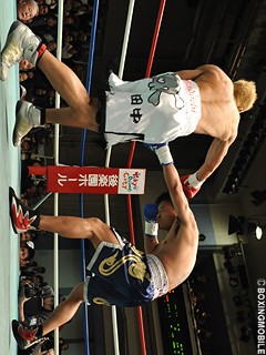 試合:開始早々、土屋が頭から入るオーベンジャマッドに右ストレートを打ち込む。ここから立て続けに左フック・右ストレートをクリーンヒット。オーベンジャマッドは弾かれるようにダウン喫し、立ち上がろうとするが膝から崩れ10カウント。土屋が1R30秒、対戦相手に何もさせず、9戦9勝9KOとなる電光石火のKO劇を演出した。★